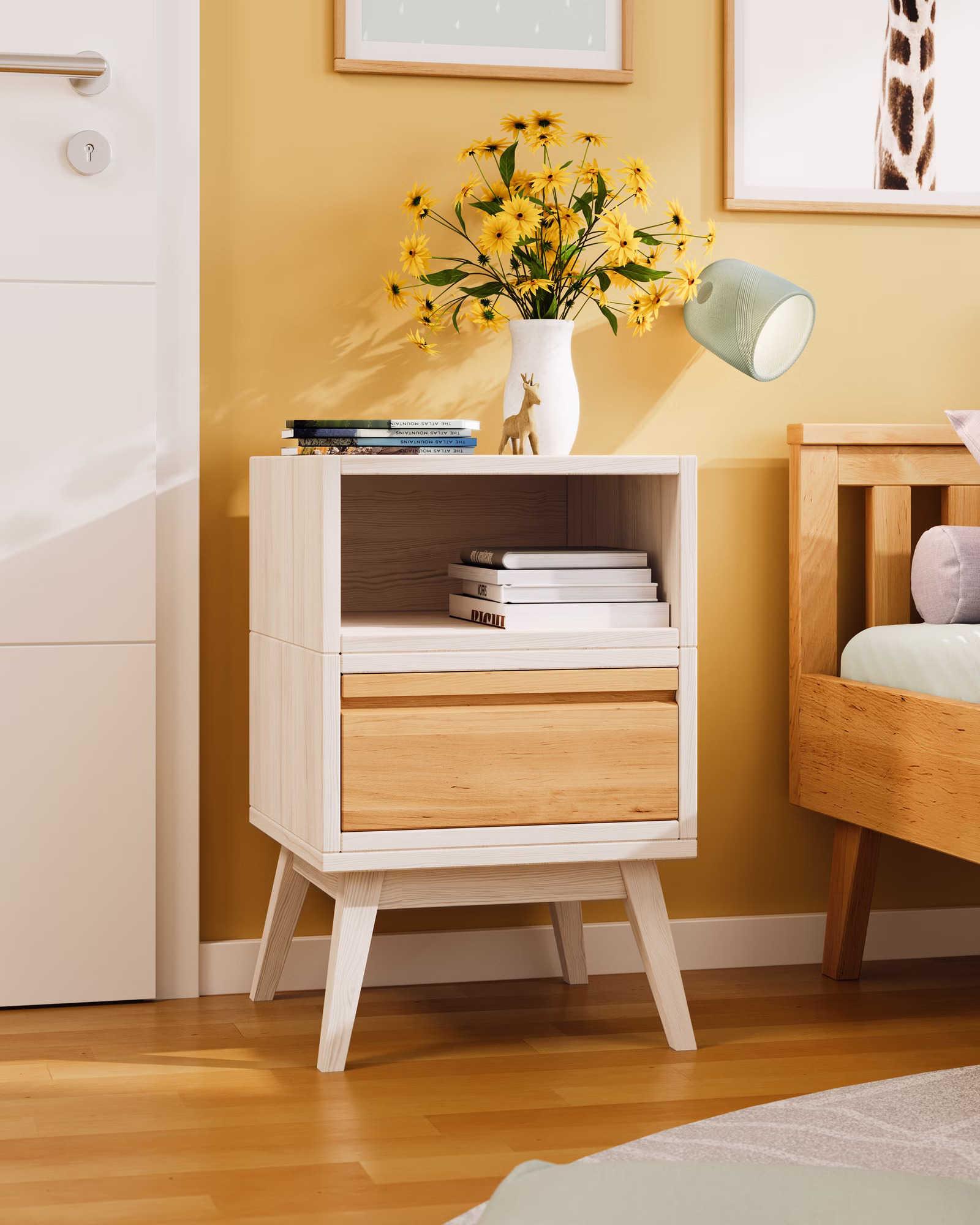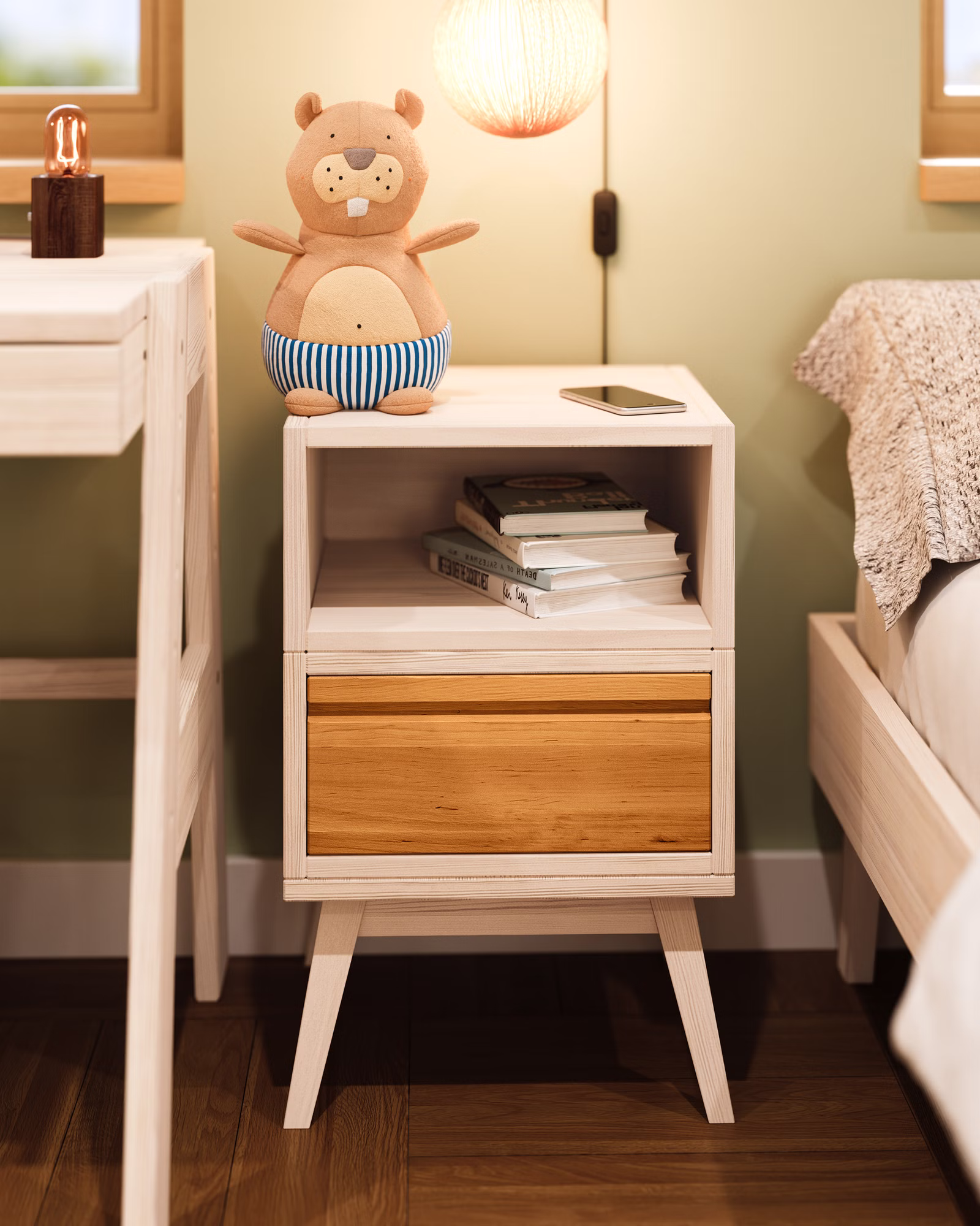 Unser Laura Retro Nachttisch wird aus Bio-Massivholz gefertigt und lässt sich vielseitig einsetzen. Die Kombination aus offenen und geschlossenen Laura Regalwürfeln und dem elegant niedrigen Retrosockel versprüht einen nostalgischen Charme und wirkt gleichzeitig modern und zeitlos. So fügt sich der Nachttisch harmonisch in jedes Zimmer ein und passt zu jedem Einrichtungsstil.