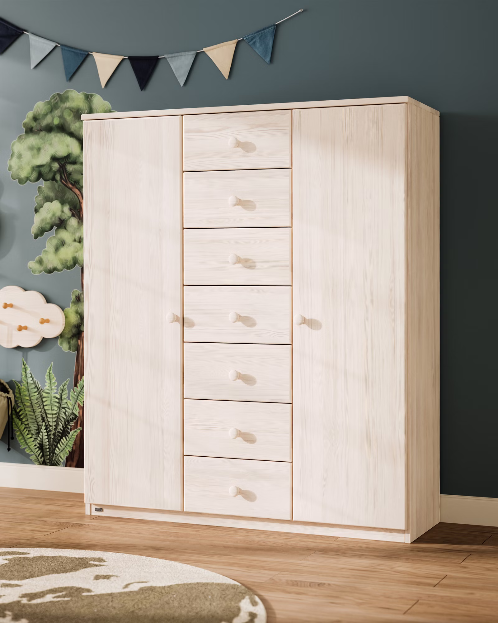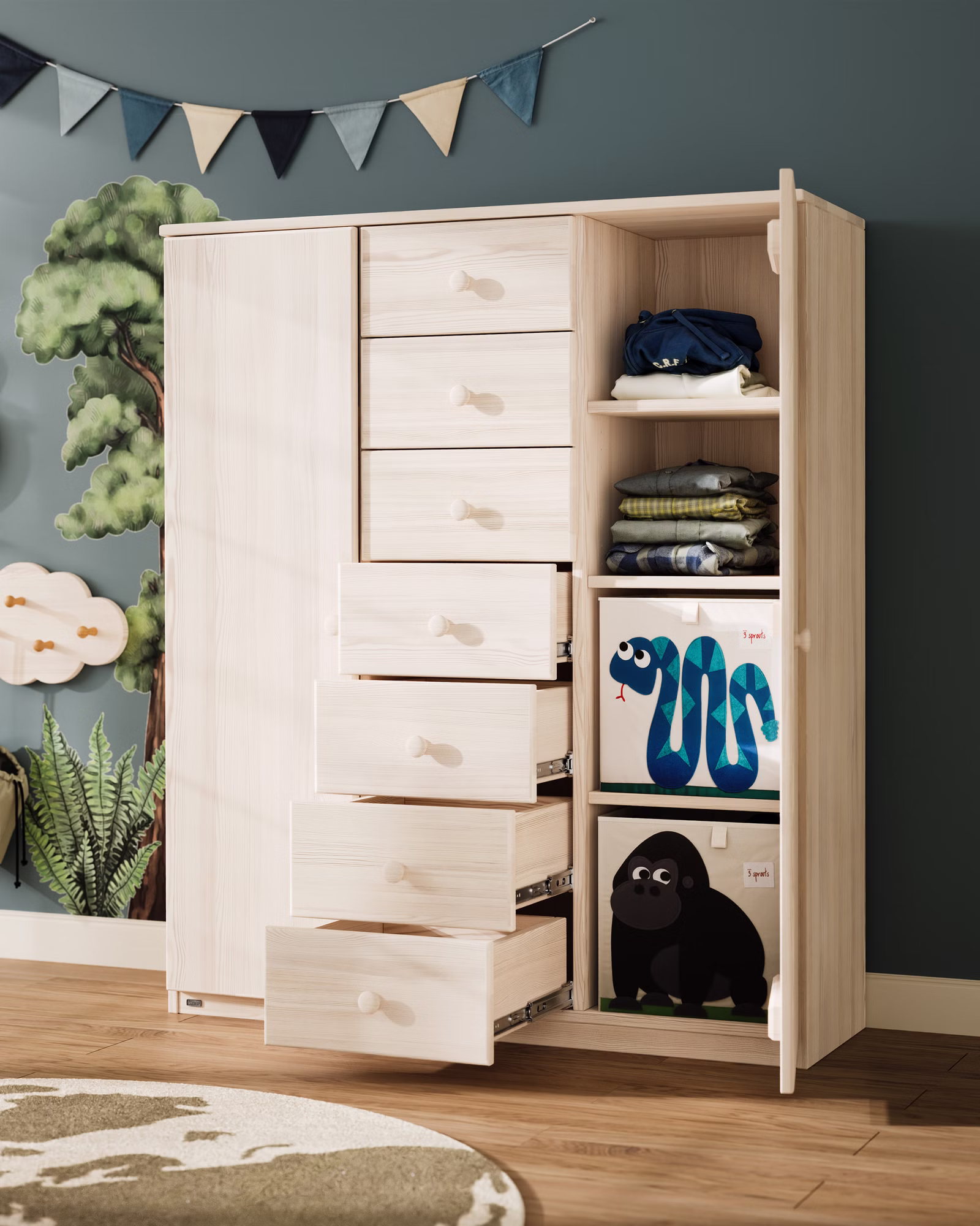 Formschöne Symbiose aus Schrank und Kommode für vielfältige Aufbewahrungsmöglichkeiten. David sieht auch im Flur als Garderobenmöbel oder Schuhschrank gut aus. Die intelligente Aufteilung in Schubladenelemente und Regalböden schafft übersichtlichen Platz für Spielsachen, Kleidungstücke, Bettwäsche. So bietet der David Kommoden- und Kinderschrank den Komfort eines Kleiderschrankes bei idealer Raumnutzung im kleineren Kinderzimmer.