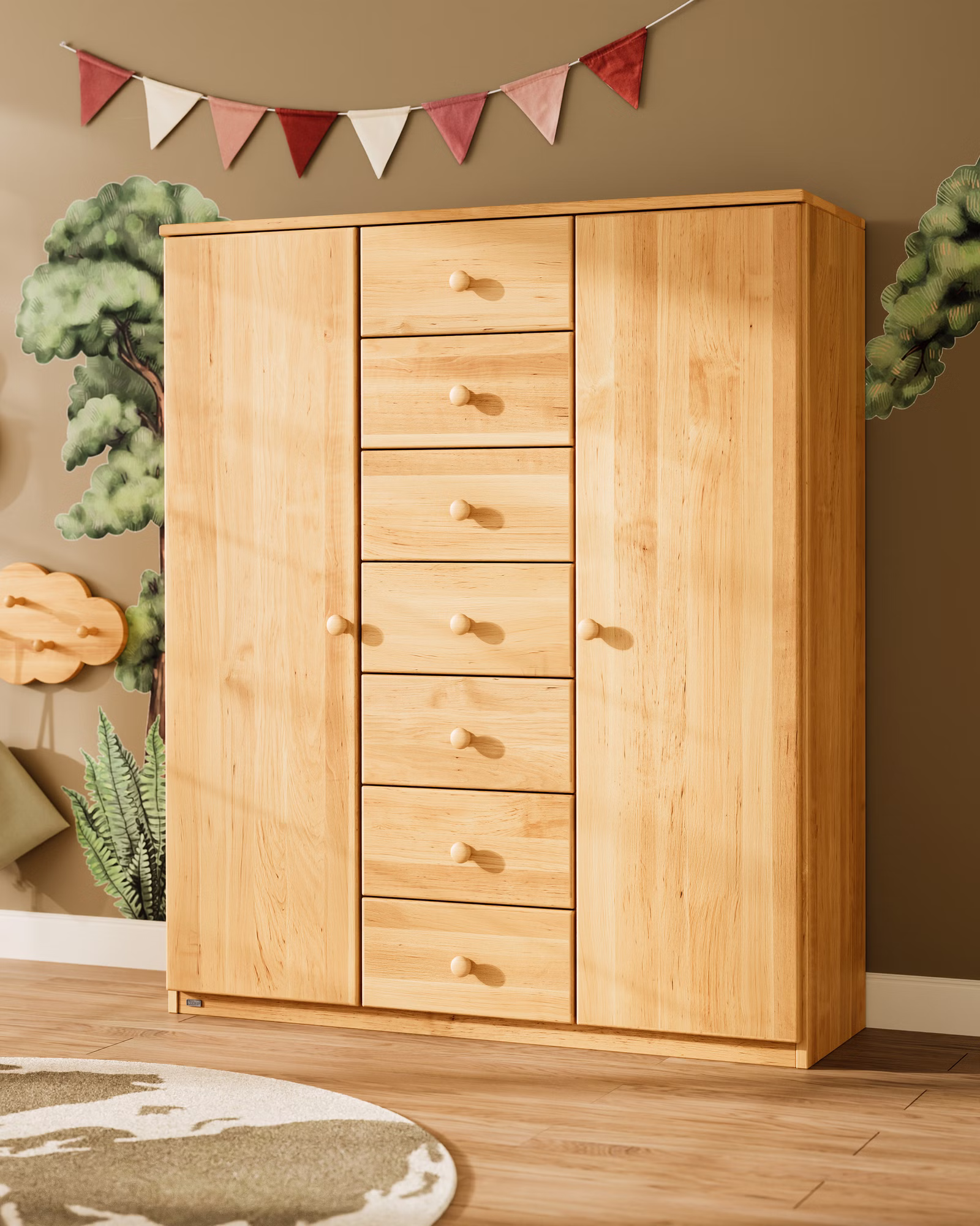 Formschöne Symbiose aus Schrank und Kommode für vielfältige Aufbewahrungsmöglichkeiten. David sieht auch im Flur als Garderobenmöbel oder Schuhschrank gut aus. Die intelligente Aufteilung in Schubladenelemente und Regalböden schafft übersichtlichen Platz für Spielsachen, Kleidungstücke, Bettwäsche. So bietet der David Kommoden- und Kinderschrank den Komfort eines Kleiderschrankes bei idealer Raumnutzung im kleineren Kinderzimmer.