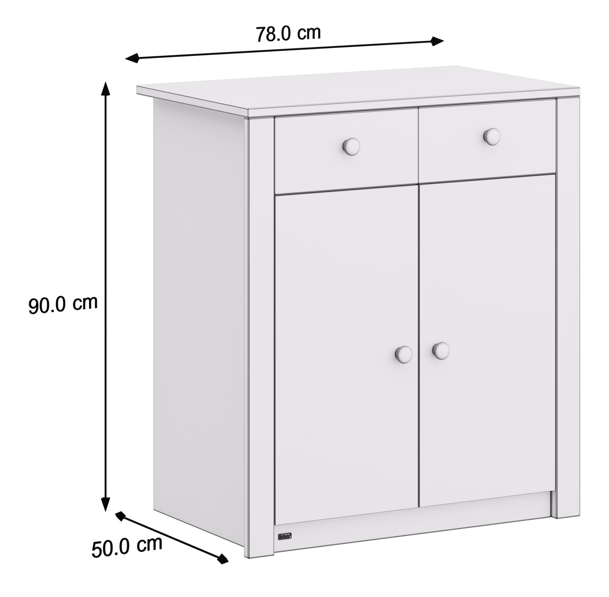 Für alle wichtigen Dinge im Leben: Die 2-türige Kommode aus Bio-Massivholz verstaut in zwei Schubladen und zwei geräumigen Fächern Kleidung, Spielzeug und andere Lieblingssachen.