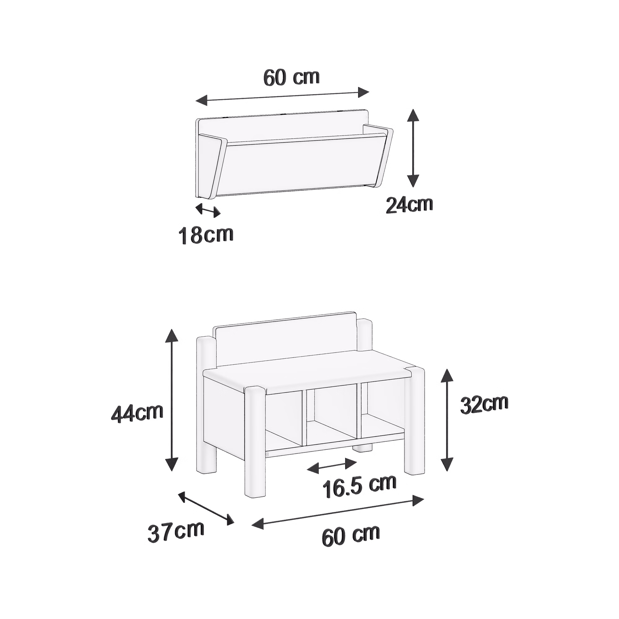 Maße Garderobenbank: L 60 cm, 80 cm, 100 cm, 120 cm; T 37 cm; H 44 cm; Sitzhöhe 32 cm
