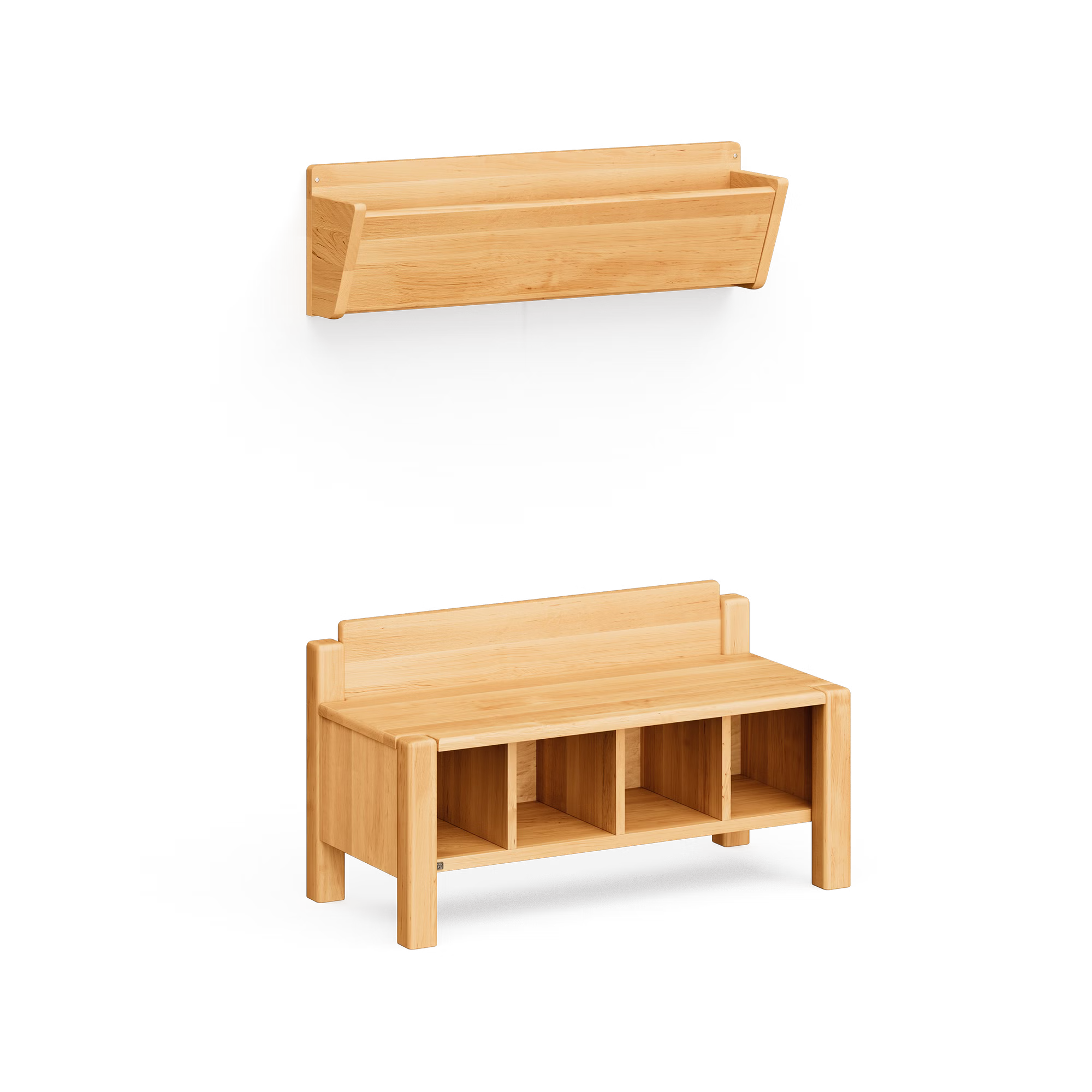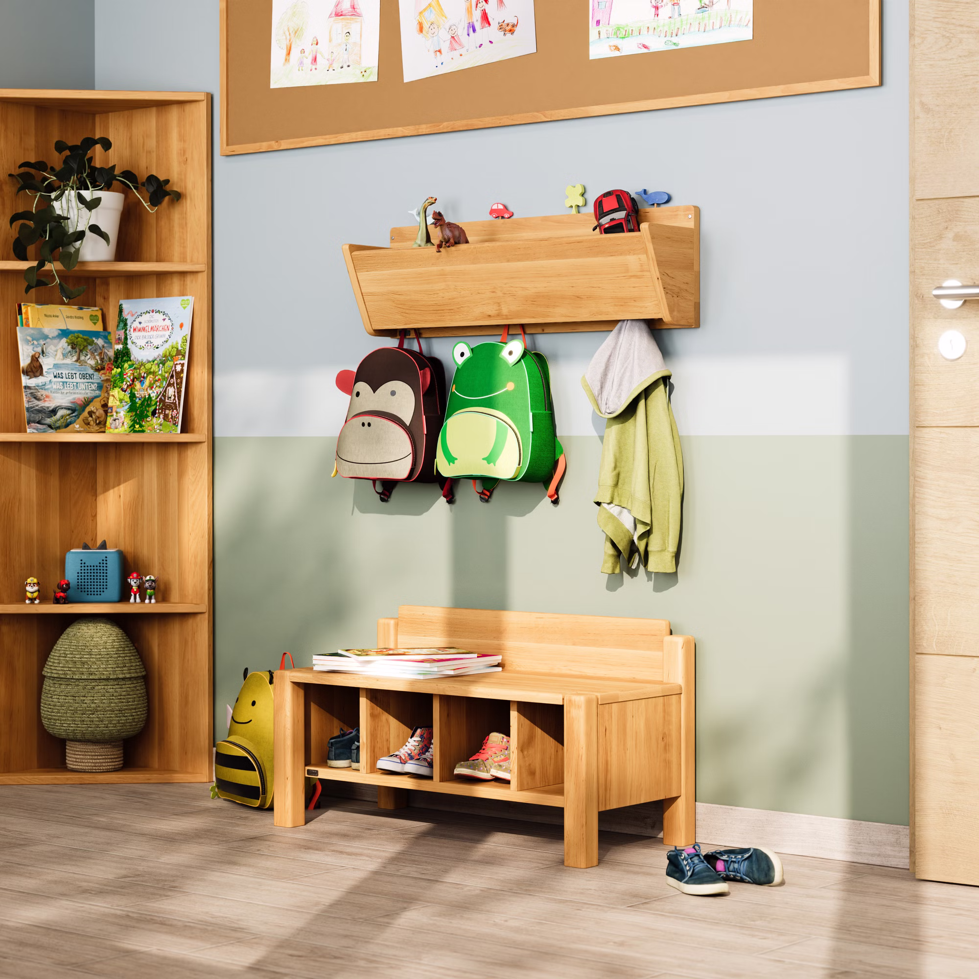 Das Robin Garderoben-Set aus massivem Bio-Erlenholz schafft natürliche Ordnung und unterstützt Kinder im Flur, Kinderzimmer oder in der Kita beim selbstständigen An- und Ausziehen. Hängegarderobe und Garderobenbank bieten kindgerechte Funktionalität, robuste Qualität und eine warme, natürliche Ausstrahlung.
