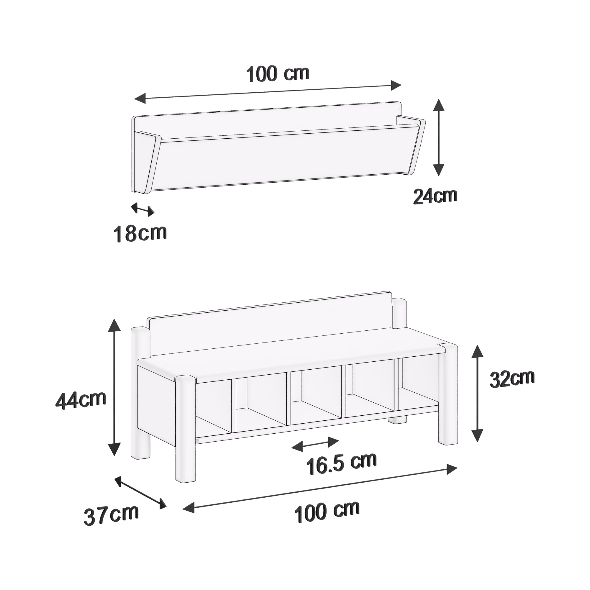 Das Robin Garderobenduo. Die Robin Kindergartenserie sorgt in der Kita und Zuhause für wohnliches Ambiente mit Überblick. An der Robin Hängegarderobe (Artikel Nr. 23619) mit verdeckten Haken bringen Kinder ihre Kappen, Mützen, Handschuhe und Rucksäckchen unter. Auf der Robin Garderobenbank (Artikel Nr. 23620) sitzen sie von Anfang an ergonomisch und verstauen ihre Schuhe in den drei Fächern unter der Sitzfläche. Natürlich mit Rückwand, damit nichts hinter die Bank fällt. Die obere Kante der Hänge-Garderobe ist mit passgenauen Bohrungen für die Grimm's Motivstecker versehen