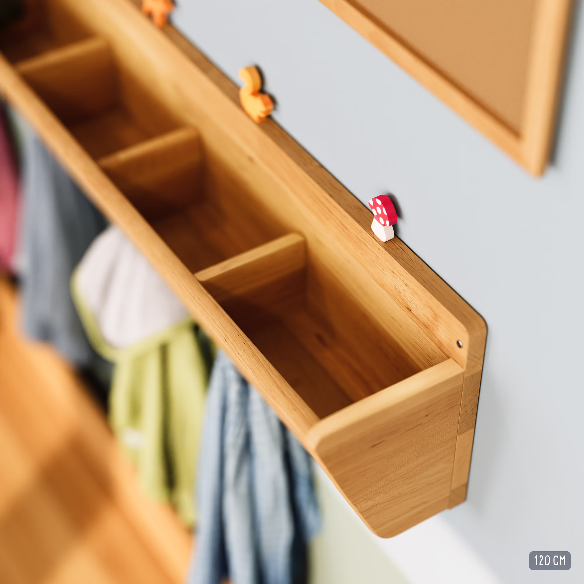 Das Robin Garderobenduo. Die Robin Kindergartenserie sorgt in der Kita und Zuhause für wohnliches Ambiente mit Überblick. An der Robin Hängegarderobe (Artikel Nr. 23619) mit verdeckten Haken bringen Kinder ihre Kappen, Mützen, Handschuhe und Rucksäckchen unter. Auf der Robin Garderobenbank (Artikel Nr. 23620) sitzen sie von Anfang an ergonomisch und verstauen ihre Schuhe in den drei Fächern unter der Sitzfläche. Natürlich mit Rückwand, damit nichts hinter die Bank fällt. Die obere Kante der Hänge-Garderobe ist mit passgenauen Bohrungen für die Grimm's Motivstecker versehen