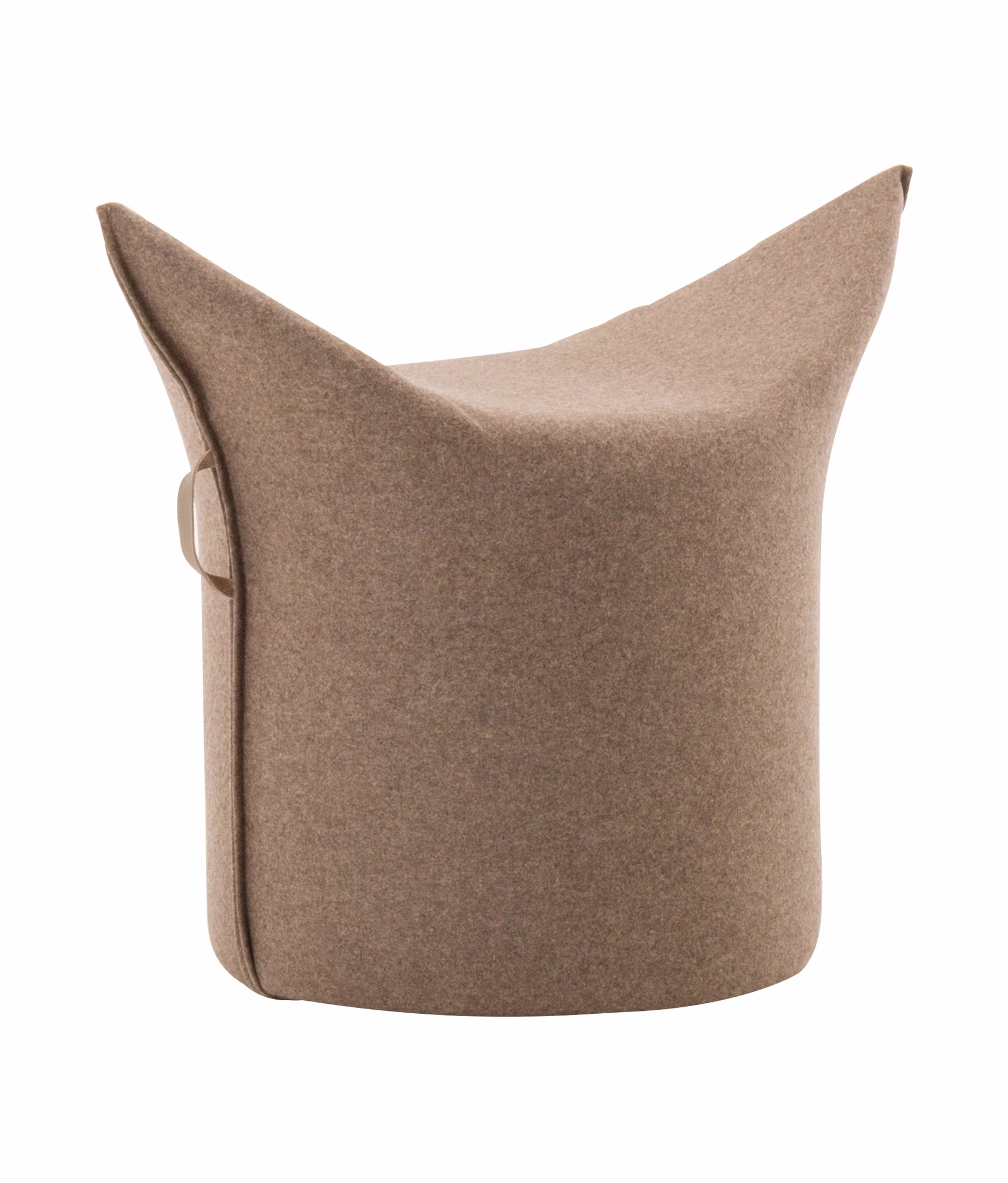 Gestell aus Hartschaum und Holz. Sitzauflage aus Polyesterschaum, abgedeckt mit Polyestervlies. Bezug aus robustem Wollfilz. Griffschlaufen aus Leder.