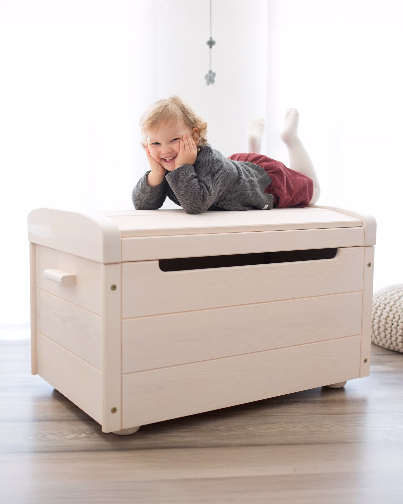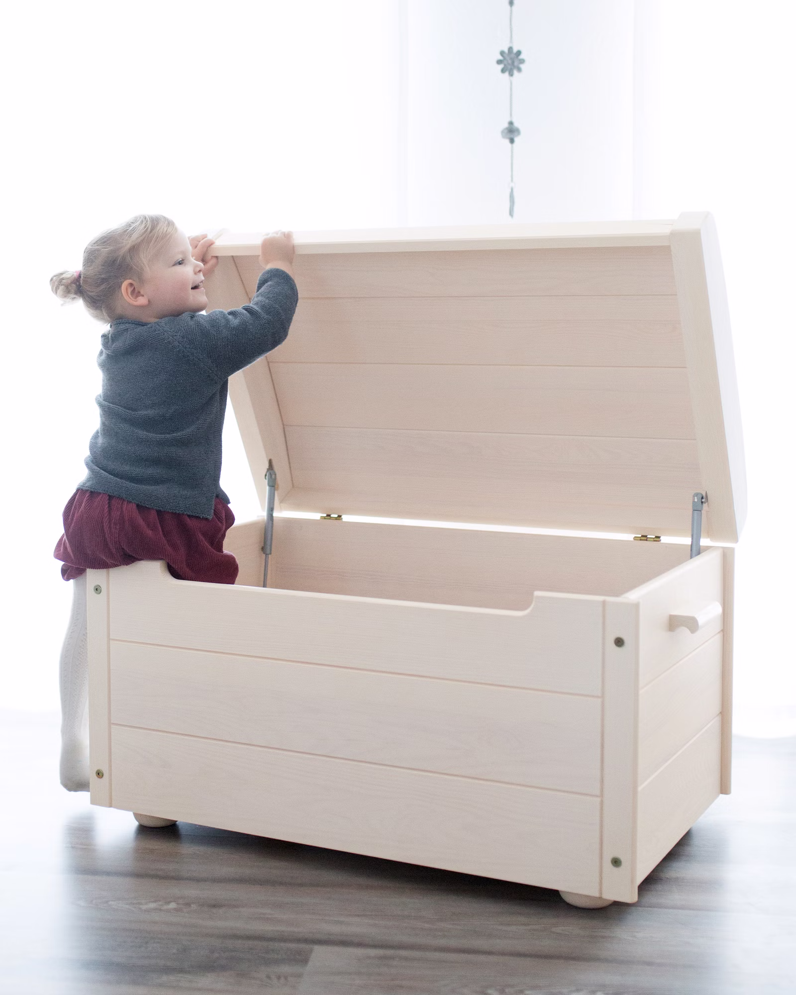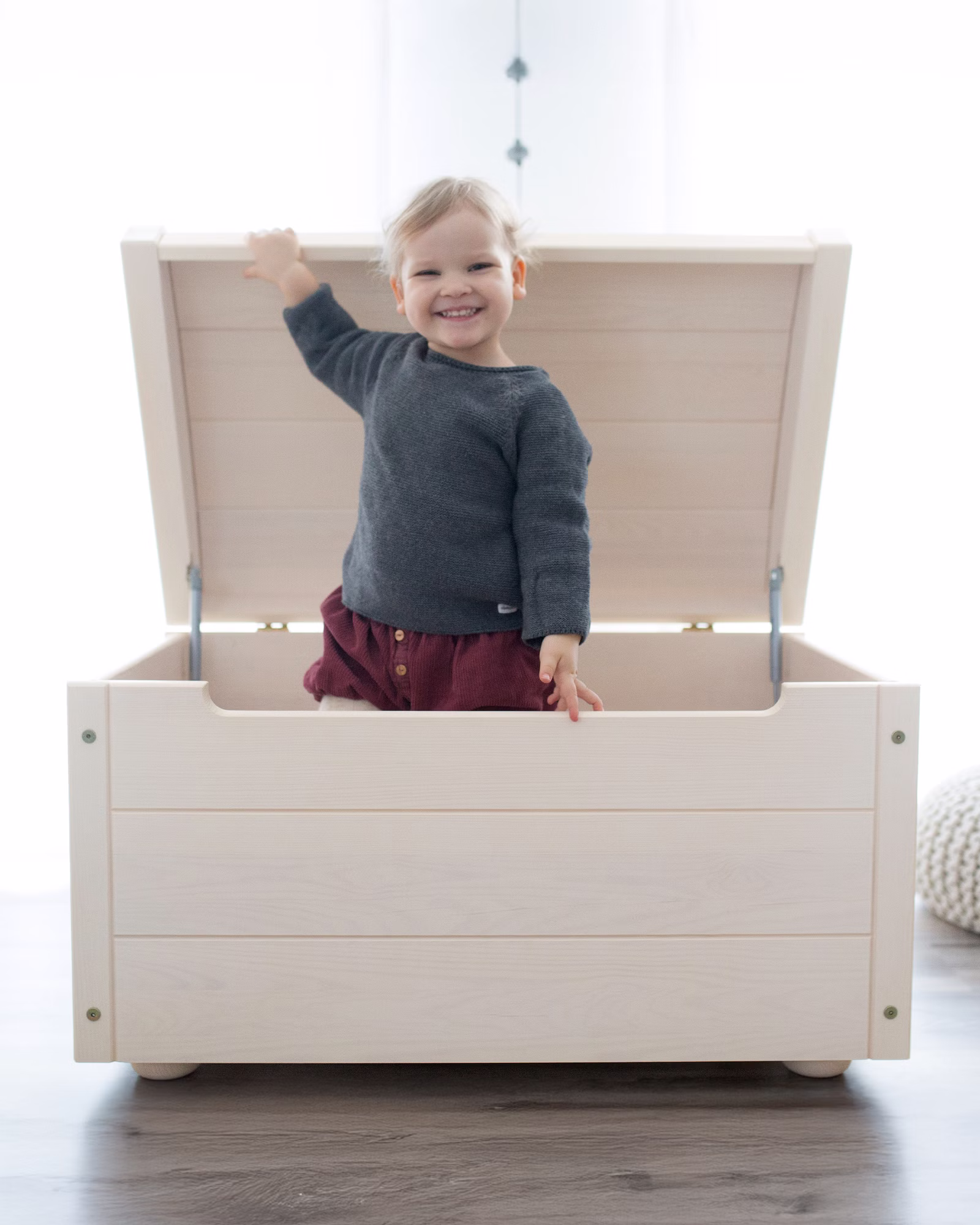 Clevere kindgerechte Details: Ein speziell entwickelter Mechanismus lässt den Deckel langsam absinken und schützt Kinderhände. Durch den breiten Belüftungsspalt zirkuliert auch bei geschlossenem Deckel genügend Sauerstoff. Ein nachhaltiges multifunktionales Ordnungsmöbel.