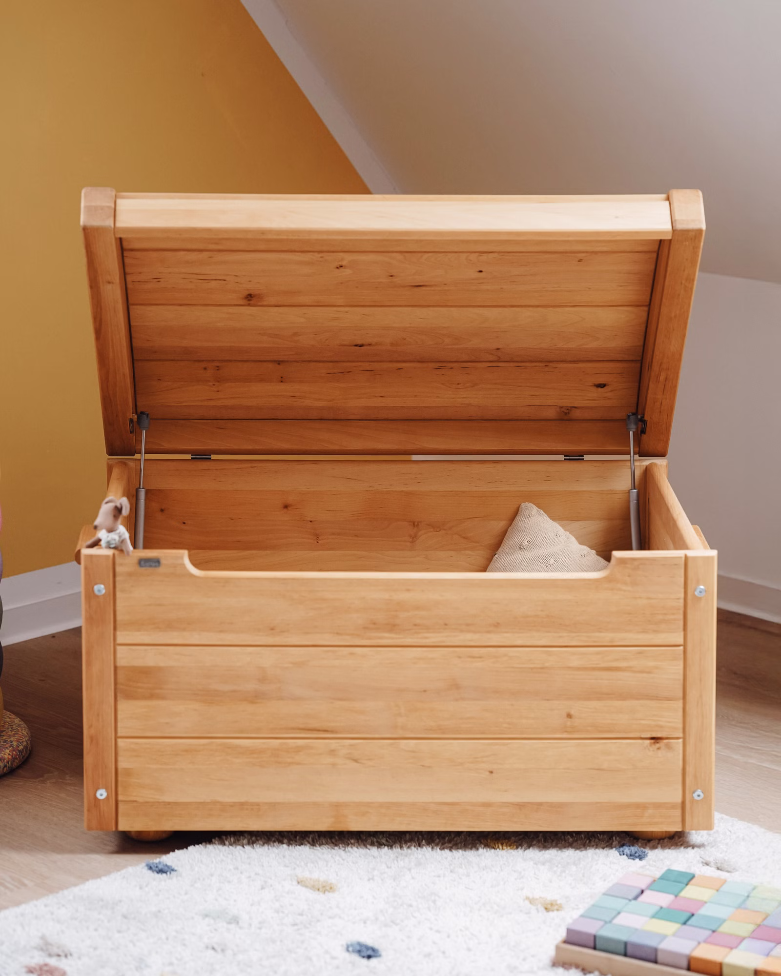 Clevere kindgerechte Details: Ein speziell entwickelter Mechanismus lässt den Deckel langsam absinken und schützt Kinderhände. Durch den breiten Belüftungsspalt zirkuliert auch bei geschlossenem Deckel genügend Sauerstoff. Ein nachhaltiges multifunktionales Ordnungsmöbel.