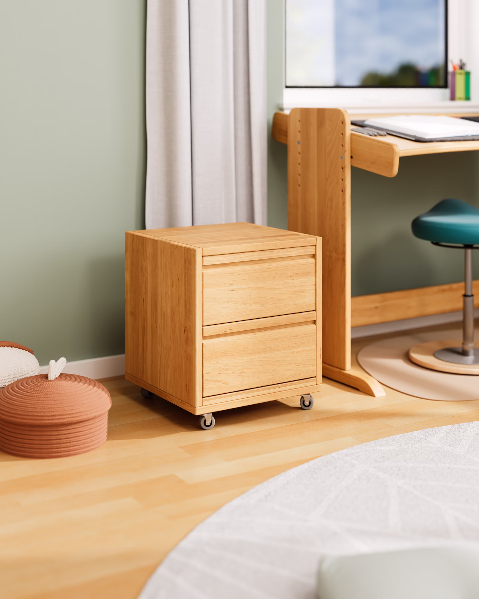 Unser Laura Rollcontainer mit zwei Schubladen wird aus Bio-Massivholz gefertigt und ist die praktische Ergänzung für jeden Schreibtisch im Kinderzimmer oder Büro. Die Schubladen können farblich auf die Einrichtung abgestimmt werden und setzen so fröhliche Farbakzente im Kinderzimmer.