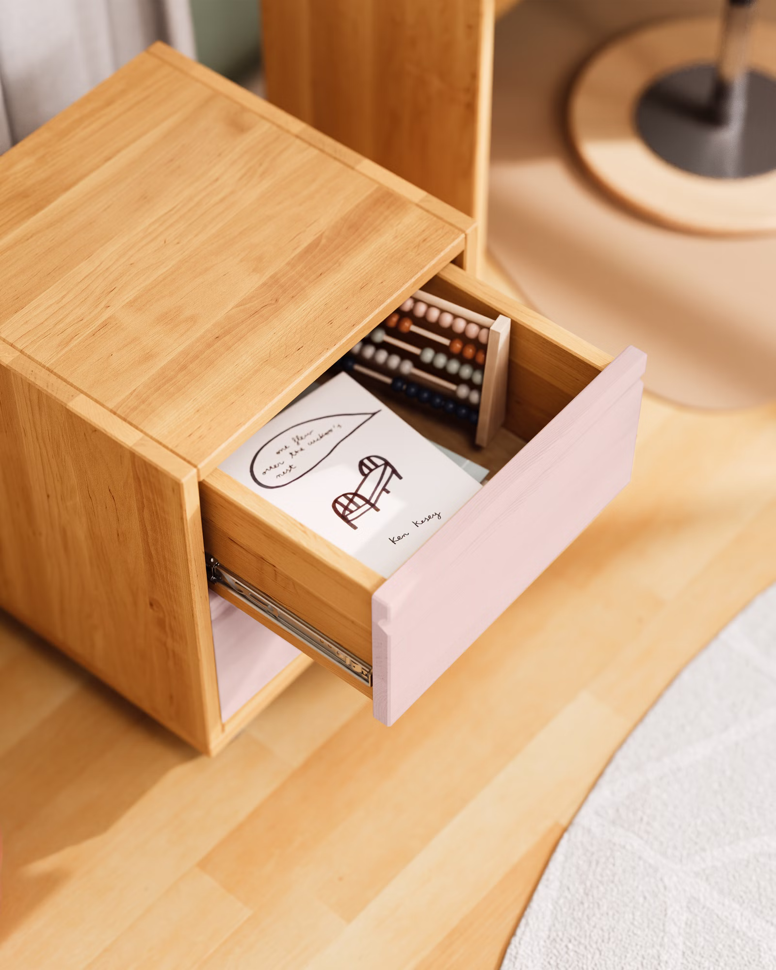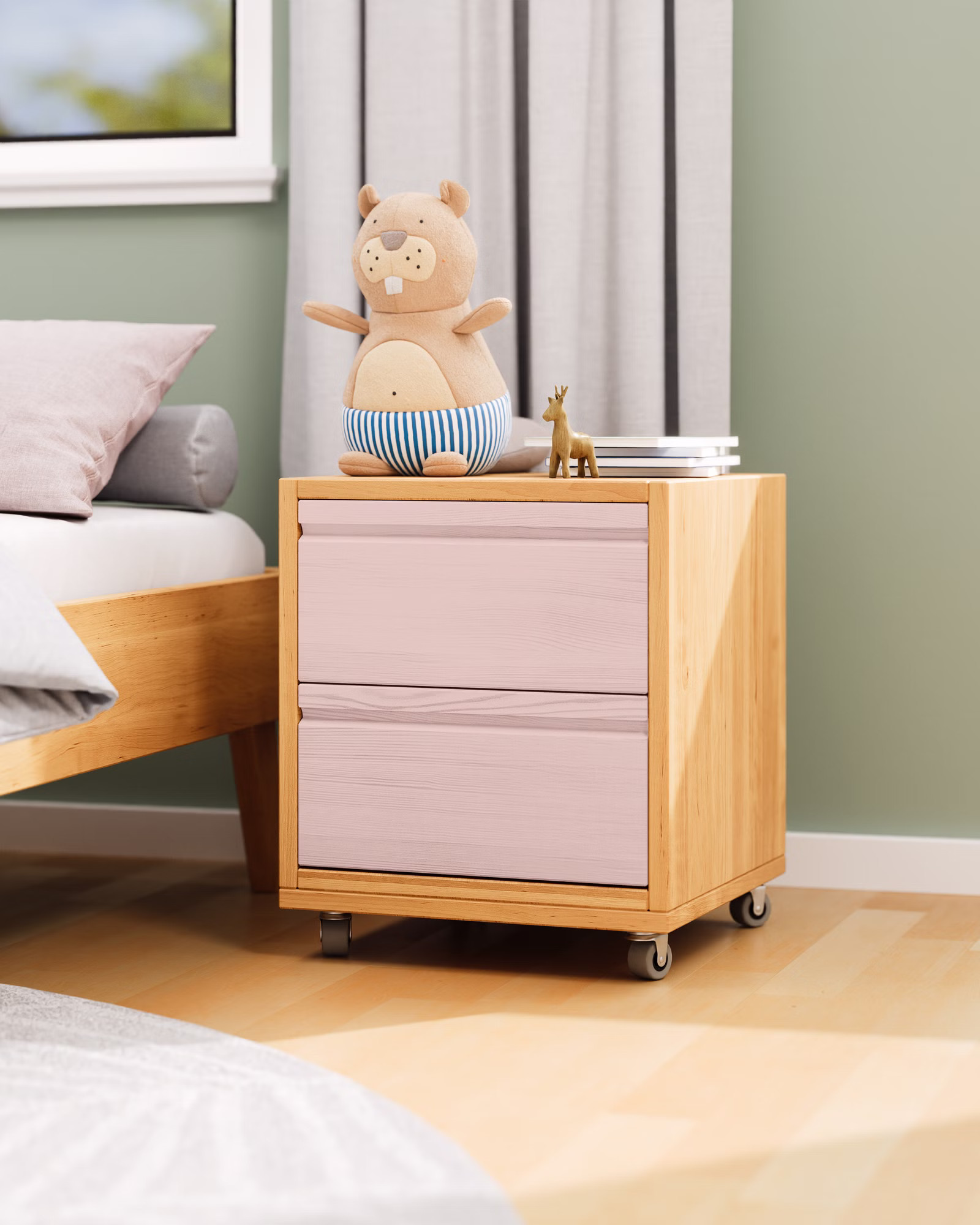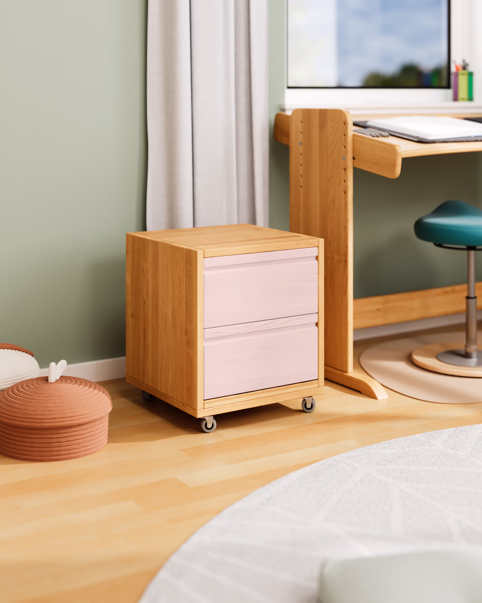 Unser Laura Rollcontainer mit zwei Schubladen wird aus Bio-Massivholz gefertigt und ist die praktische Ergänzung für jeden Schreibtisch im Kinderzimmer oder Büro. Die Schubladen können farblich auf die Einrichtung abgestimmt werden und setzen so fröhliche Farbakzente im Kinderzimmer.