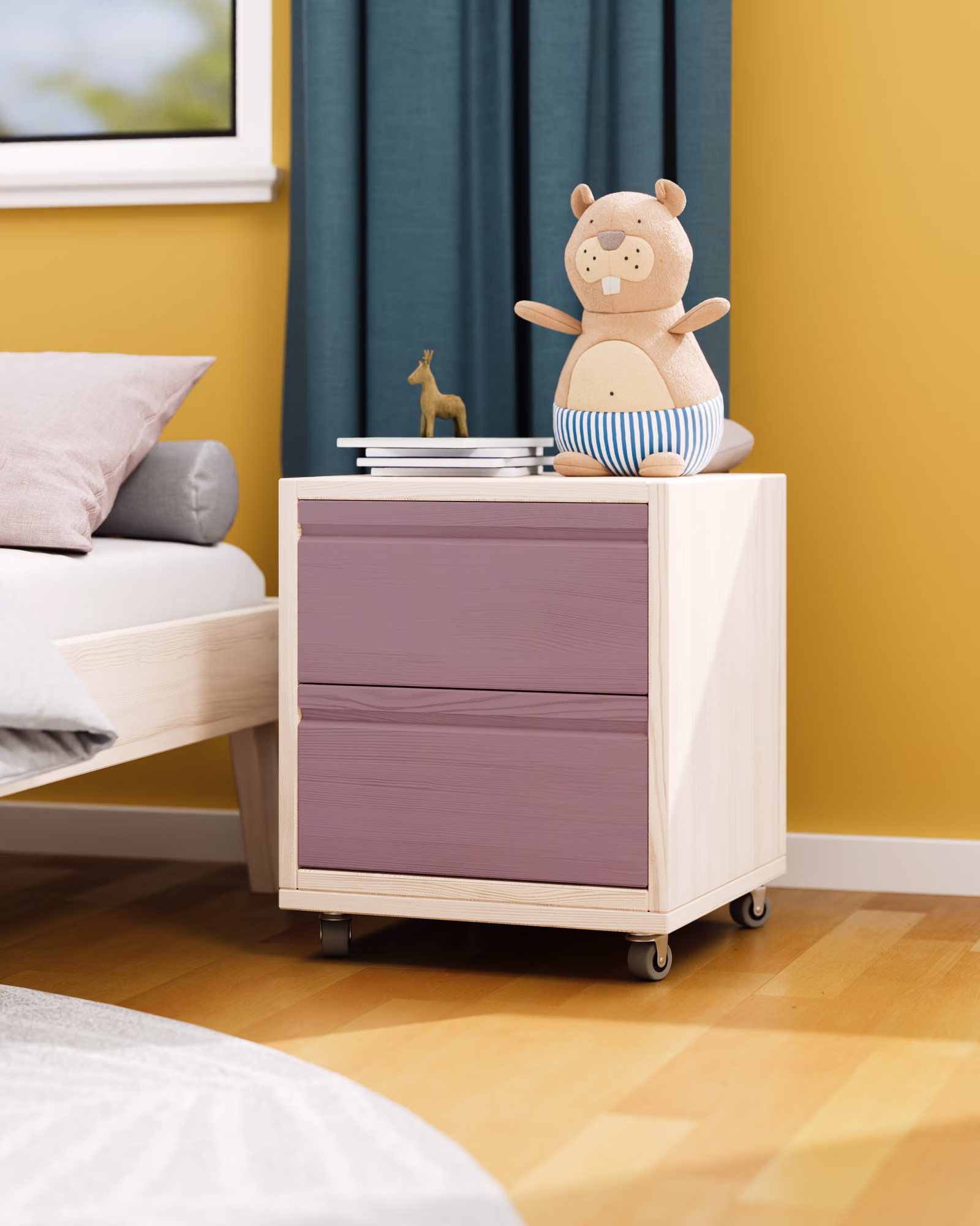 Unser Laura Rollcontainer mit zwei Schubladen wird aus Bio-Massivholz gefertigt und ist die praktische Ergänzung für jeden Schreibtisch im Kinderzimmer oder Büro. Die Schubladen können farblich auf die Einrichtung abgestimmt werden und setzen so fröhliche Farbakzente im Kinderzimmer.