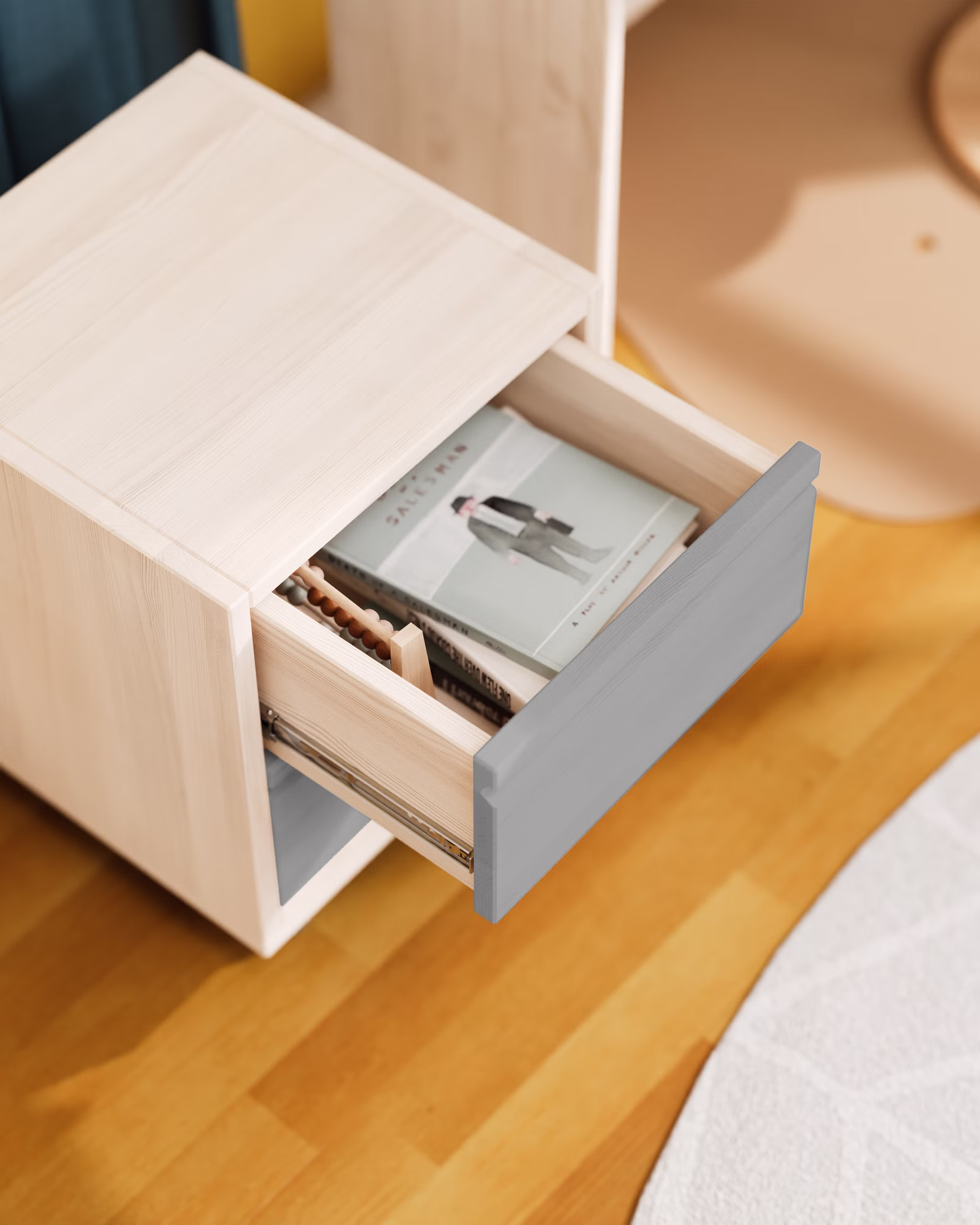 Die beiden Schubladen des Regalwürfels sind mit kugelgelagerten Leichtlaufschienen mit Selbsteinzug ausgestattet. Der integrierte Soft-Close-Mechanismus ermöglicht ein sicheres und geräuscharmes Schließen. Die Schubladen lassen sich voll ausziehen und bieten so Einblicke bis in den hintersten Bereich des Schubkastens.
