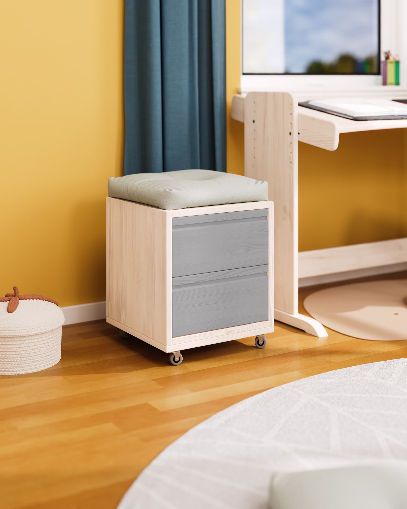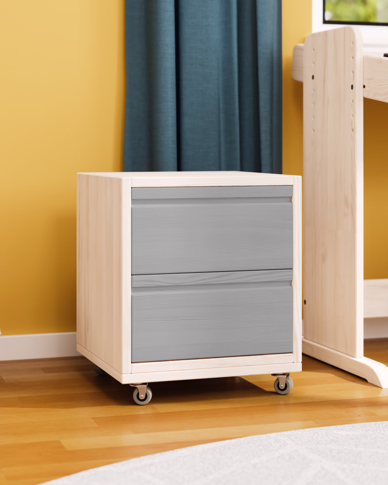 Unser Laura Rollcontainer mit zwei Schubladen wird aus Bio-Massivholz gefertigt und ist die praktische Ergänzung für jeden Schreibtisch im Kinderzimmer oder Büro. Die Schubladen können farblich auf die Einrichtung abgestimmt werden und setzen so fröhliche Farbakzente im Kinderzimmer.