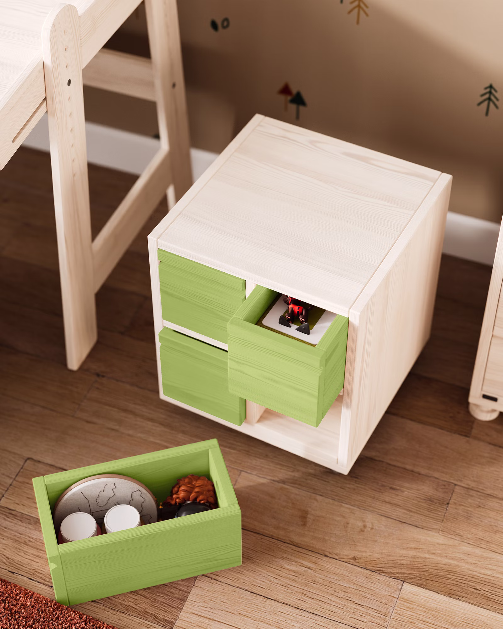 Unser Laura Rollcontainer mit vier Office-Boxen wird aus Bio-Massivholz gefertigt und ist die praktische Ergänzung für jeden Schreibtisch im Kinderzimmer oder Büro. Die Schubladen können farblich auf die Einrichtung abgestimmt werden und setzen so fröhliche Farbakzente im Kinderzimmer.