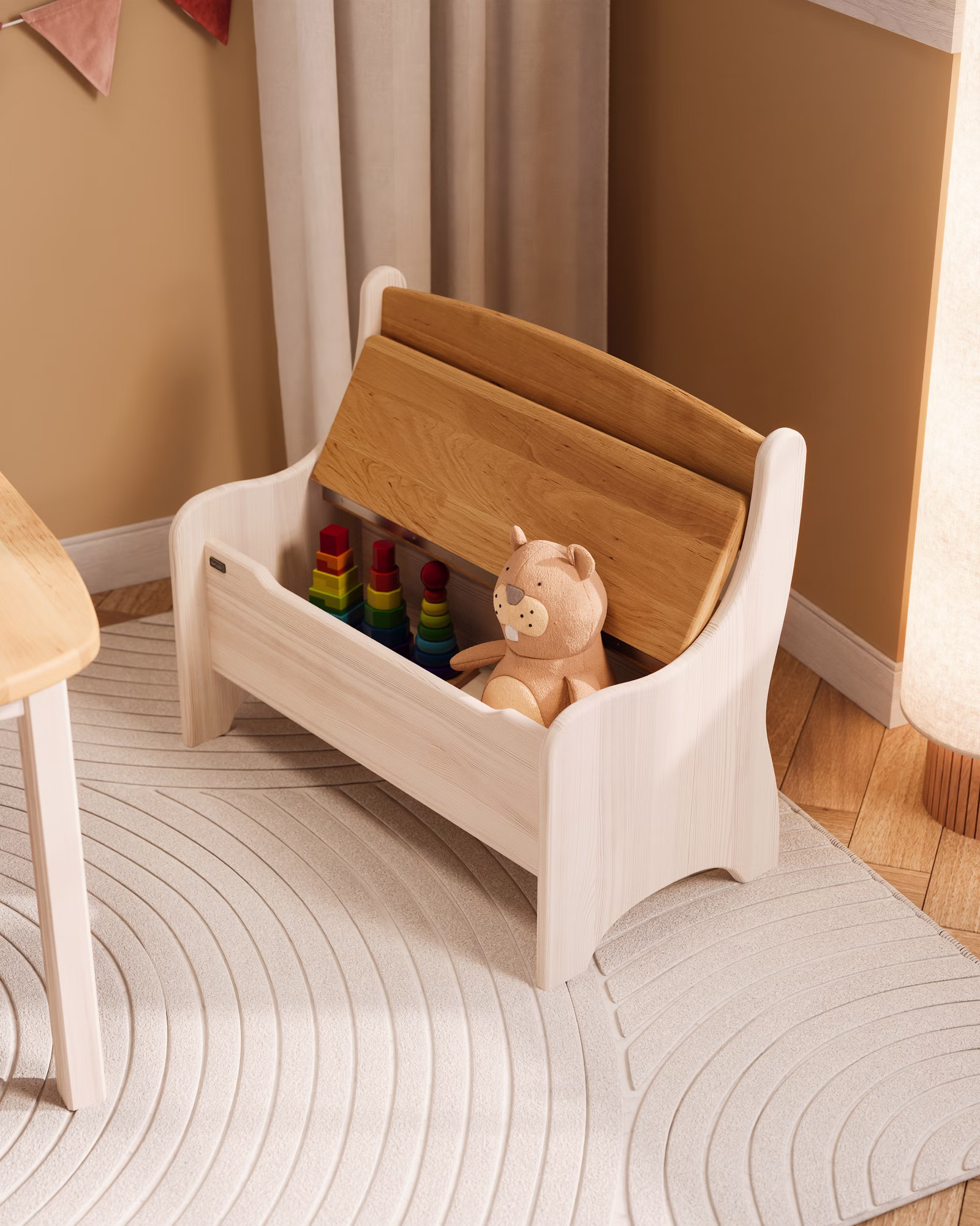 Auf der Levin Kindersitzbank sitzen, malen und spielen zwei Kinder. Auch hier haben wir besonders auf eine stabile Konstruktion mit Kippsicherheit und schöne Formgebung geachtet. Und die Levin Kindersitzbank kann noch mehr: Die Sitzfläche zurückklappen, und darunter kommt eine Spieltruhe zum Verstauen von Spielsachen und anderem zum Vorschein. Diese praktische Zwei-in-einem-Funktion macht die Levin Kindersitzbank zu einem richtig nachhaltigen Kinderzimmermöbel. In die Sitzfläche ist eine Aussparung für einfaches und sicheres Öffnen und Schließen eingearbeitet.