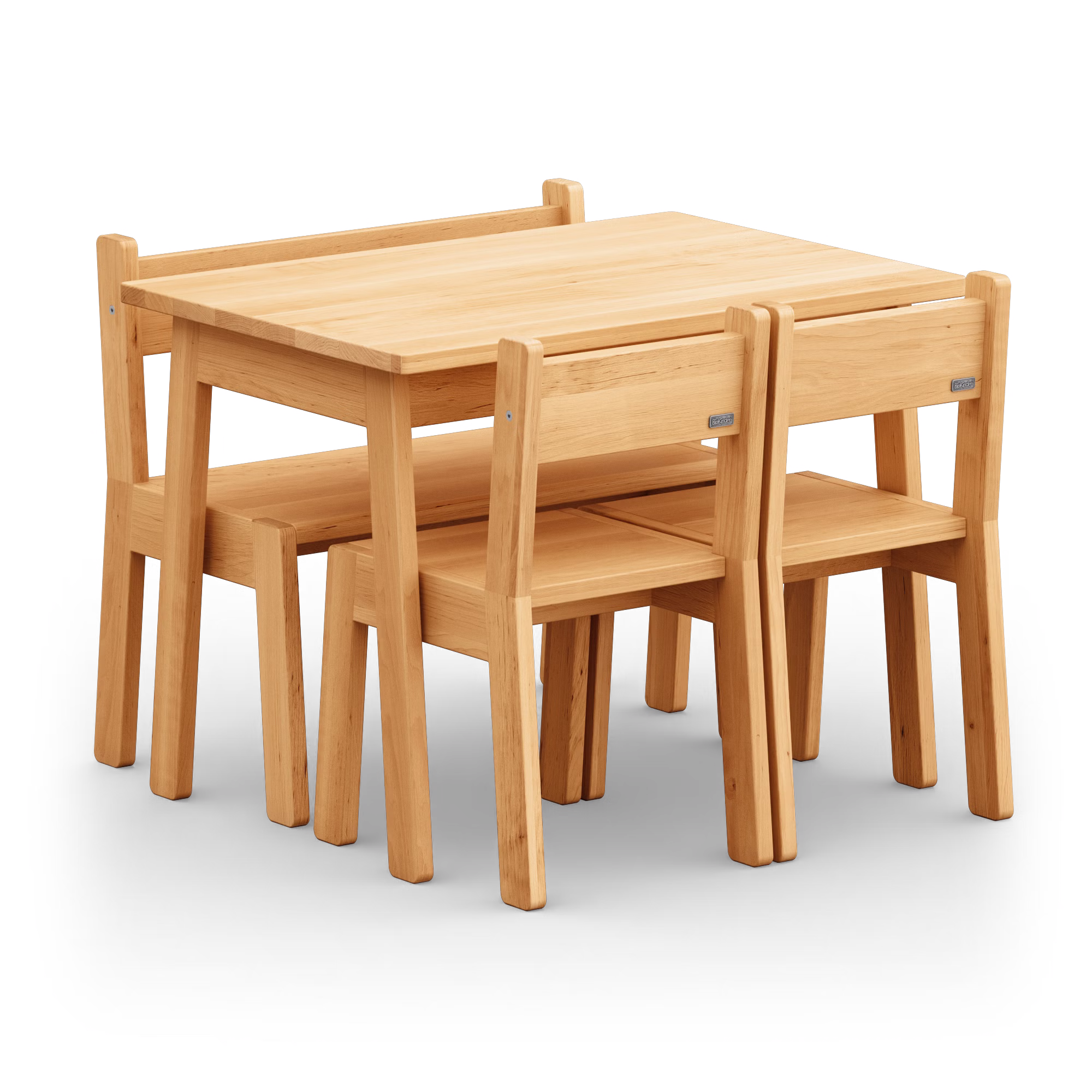 Die Sitzgruppe wird aus 100% Bio-Massivholz gefertigt und ist dadurch äußerst robust, alltagstauglich und für viele Jahre gemacht. Flache Sitzflächen, klare Linien und eine durchdachte Konstruktion machen Mogli zu einem verlässlichen Begleiter im Kinderzimmer wie auch im Kita-Alltag. Praktisch und aufgeräumt: Bank und Stühle lassen sich platzsparend unter den Tisch schieben oder einfach umgedreht auf dem Tisch verstauen.