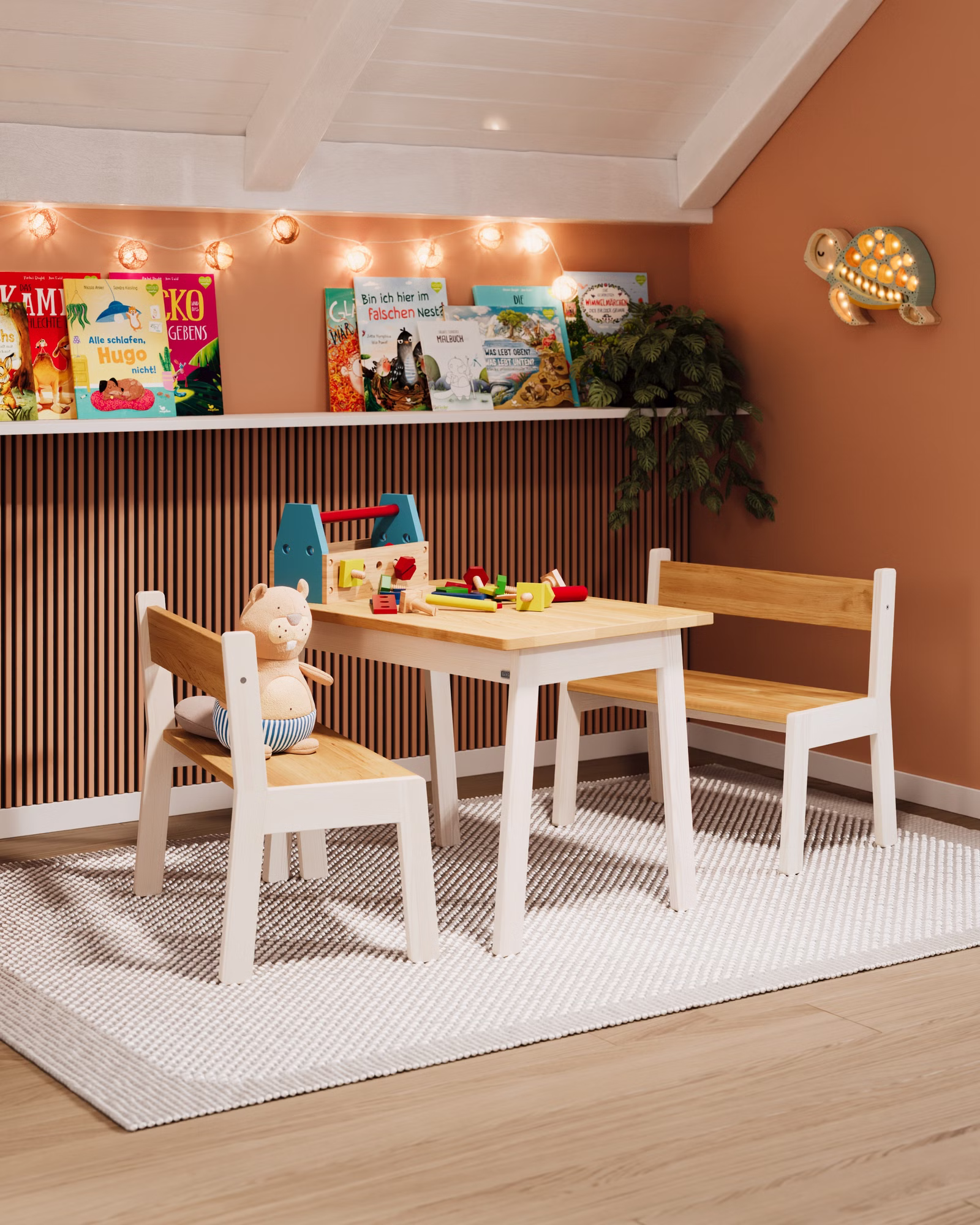 Die Mogli Sitzgruppe ist ein Ort für Ideen und große Fantasie. Ein Ort, an dem gemalt, gebastelt, gebaut, gelesen und gespielt wird. Hier entstehen Ideen, kleine Kunstwerke und große Geschichten – ganz nebenbei und ohne Vorgaben.