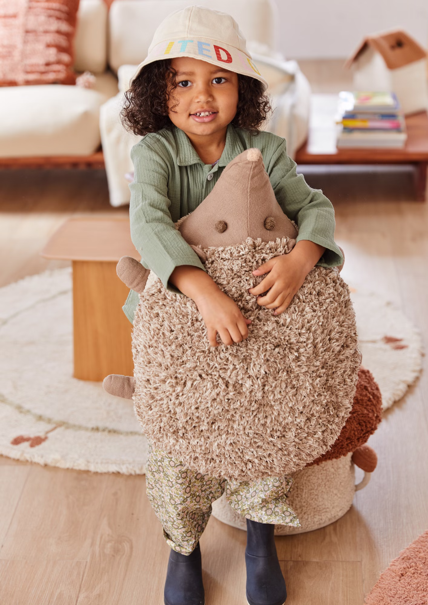 Das Igel-Bodenkissen hat winzige Pfoten und Ohren aus hellbraunem Segeltuch und Pompons als Augen und Nase.