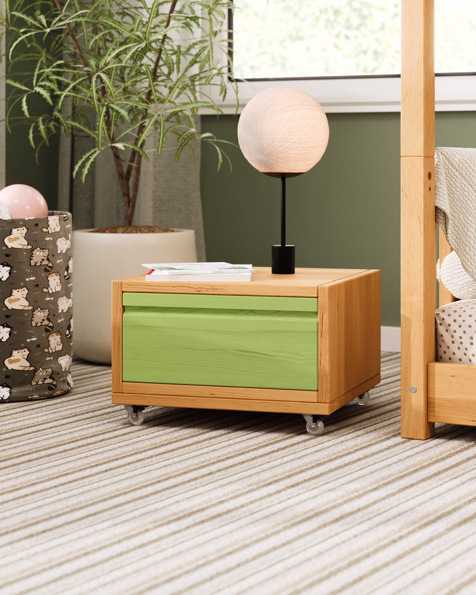 Unser Laura Nachttisch mit Schublade wird aus Bio-Massivholz gefertigt und begeistert mit seinem modernen, schlichten Design. Die Kombination aus praktischem Laura Regalwürfel und flachem Regalsockel bietet vielseitige Nutzungsmöglichkeiten. So eignet sich das Set ideal als flacher Nachttisch, mit dem wichtige Gegenstände auch nachts stets griffbereit aufbewahrt werden können. Ein passendes Sitzkissen macht den Nachttisch schnell zu einem gemütlichen Hocker und die mitgelieferten Rollen für den Regalsockel verwandeln das Set leicht in ein praktisches Rolltischchen.