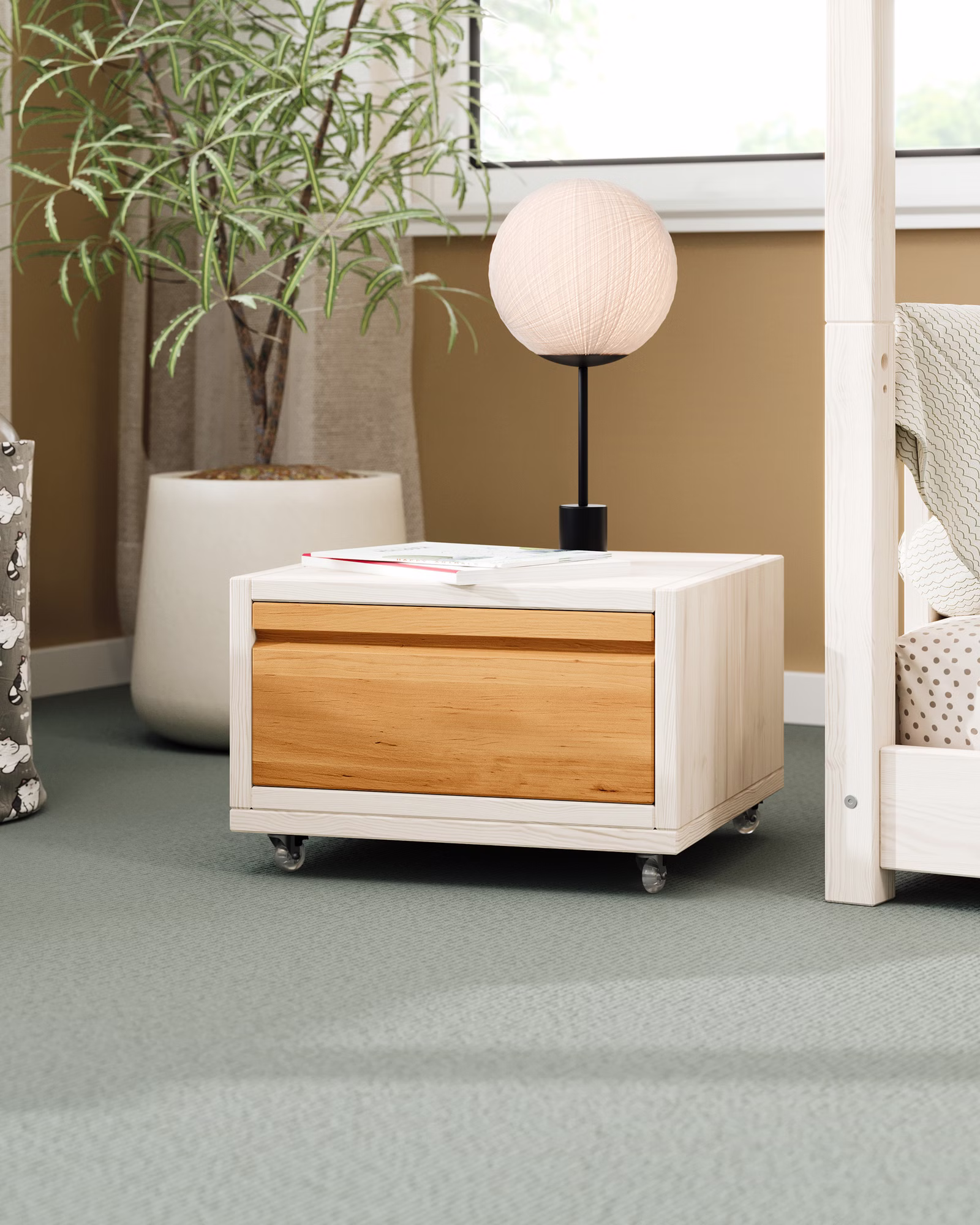 Unser Laura Nachttisch mit Schublade wird aus Bio-Massivholz gefertigt und begeistert mit seinem modernen, schlichten Design. Die Kombination aus praktischem Laura Regalwürfel und flachem Regalsockel bietet vielseitige Nutzungsmöglichkeiten. So eignet sich das Set ideal als flacher Nachttisch, mit dem wichtige Gegenstände auch nachts stets griffbereit aufbewahrt werden können. Ein passendes Sitzkissen macht den Nachttisch schnell zu einem gemütlichen Hocker und die mitgelieferten Rollen für den Regalsockel verwandeln das Set leicht in ein praktisches Rolltischchen.