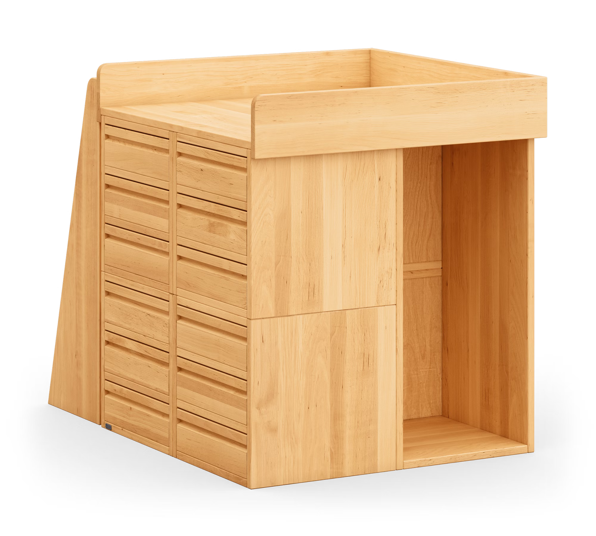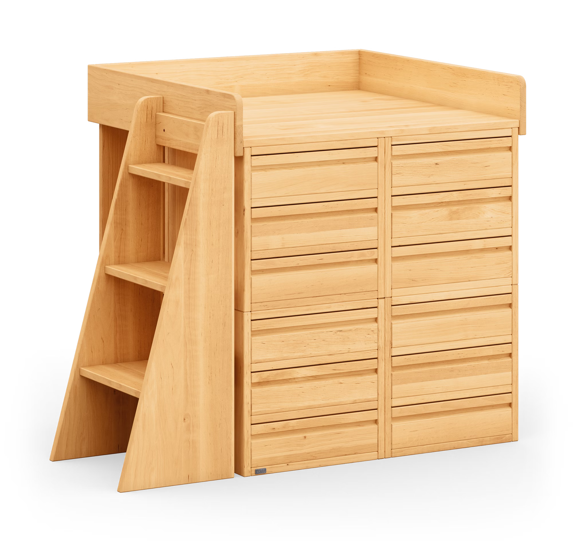 Die einzelnen Elemente dieses Sets lassen sich zu einem individuellen Wickeltisch zusammenfügen, der immer wieder neugestaltet werden kann.