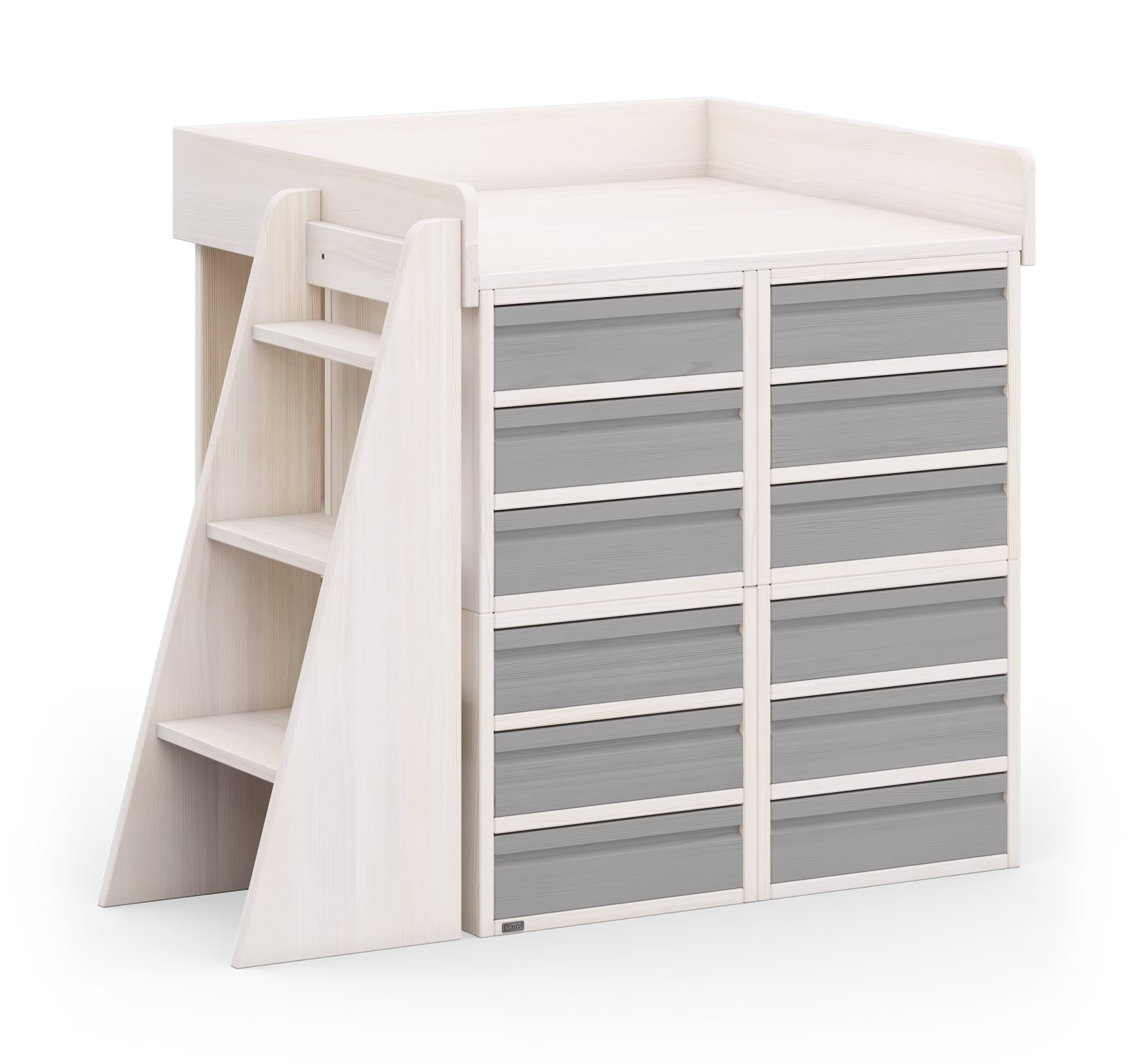 Dank zwölf geräumigen Schubladen können Wickelutensilien, Kleidung und Spielzeug speziell für jedes Kind separat und geordnet verstaut werden. Die elegant gefrästen Griffmulden an der Vorderseite der Schubladen und das schöne Griffloch hinten ermöglichen eine individuelle Gestaltung der Front und ein leichtes Öffnen und Schließen.