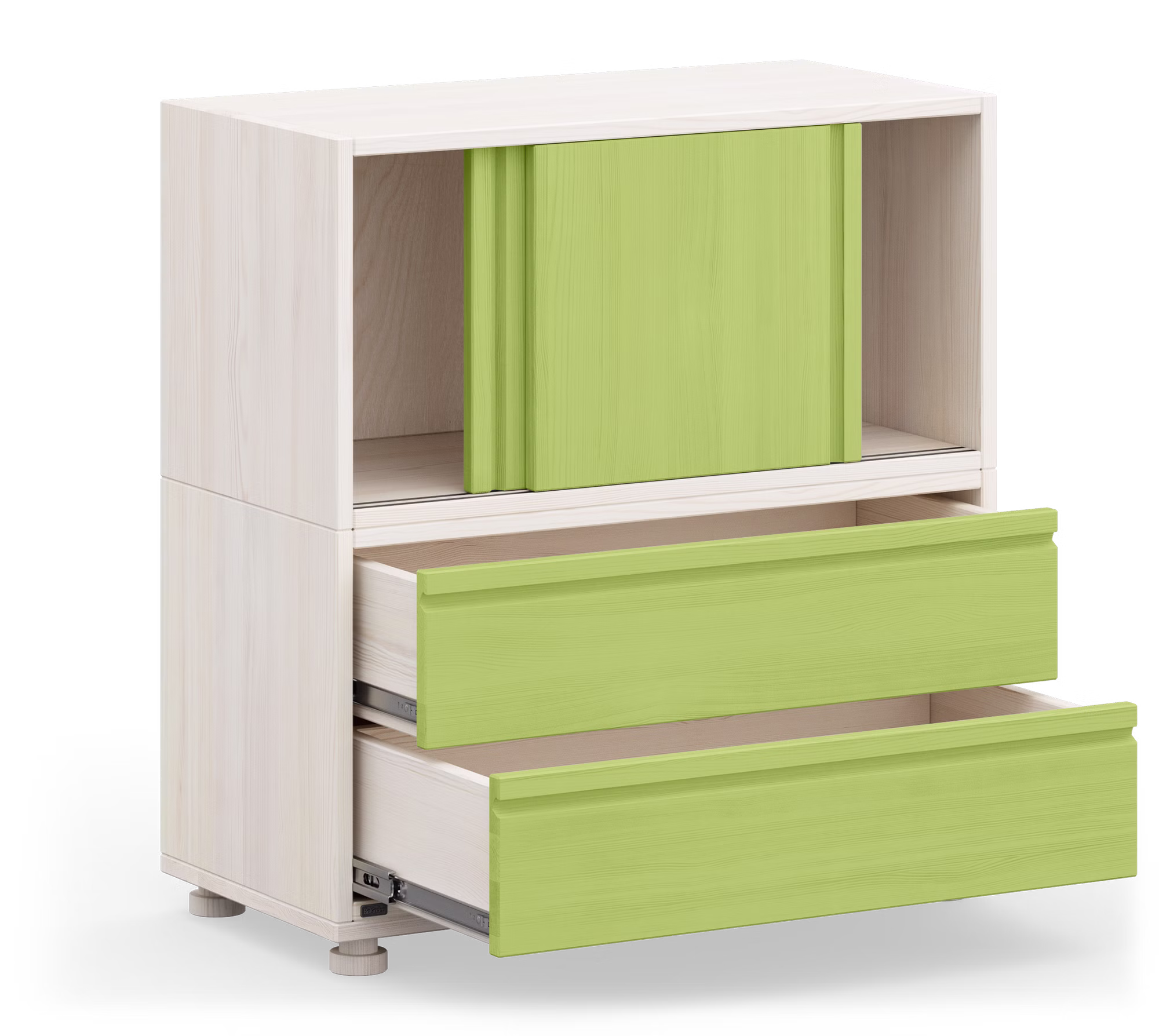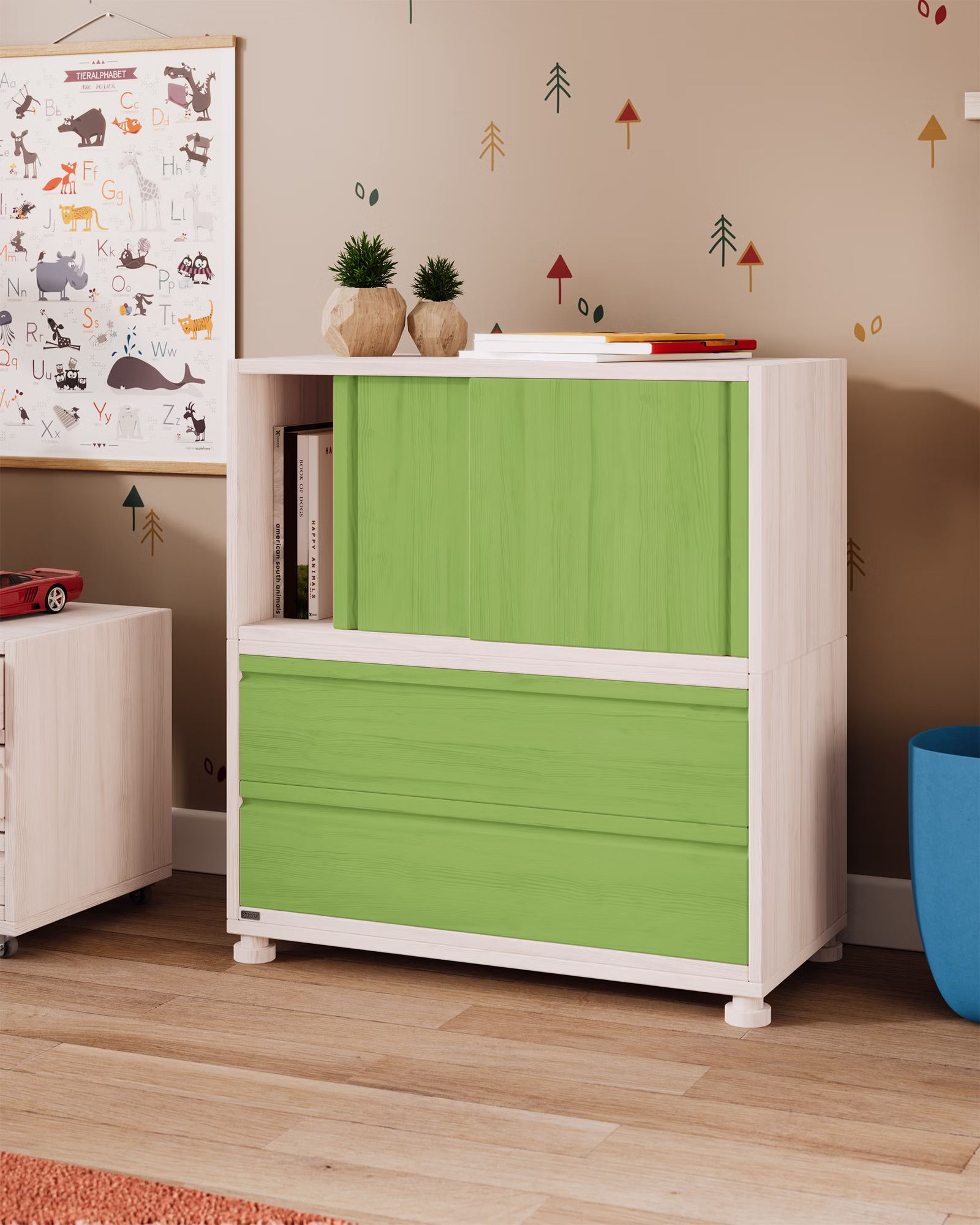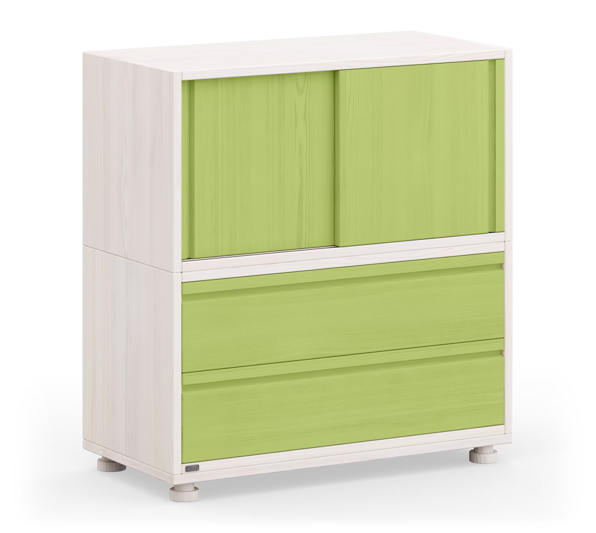 Unser Laura Set Kommode mit Schiebetüren und Schubladen wird aus hochwertigem Bio-Massivholz gefertigt und lässt sich flexibel einsetzen. Als Kommode, Regal oder Raumtrenner ist diese Laura Kommode die perfekte Ergänzung für jedes Kinderzimmer und passt dabei auch ideal in Dachschrägen.