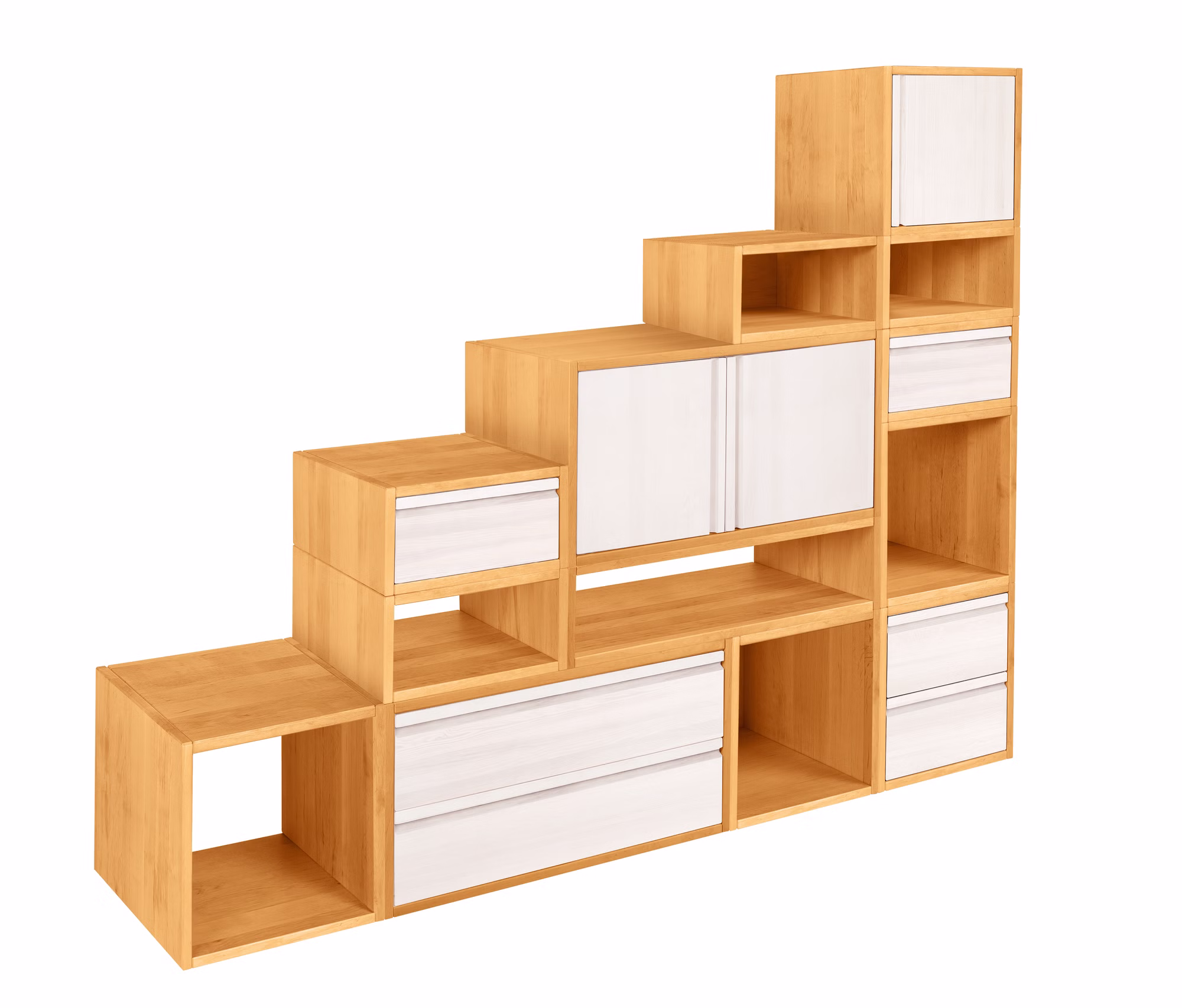 Die Schubladen und Türen der einzelnen Regalwürfel sind mit Soft-Close-Mechanismus für ein sicheres und geräuscharmes Schließen ausgestattet. Die Schubladen verfügen zudem über kugelgelagerte Leichtlaufschienen mit Selbsteinzug. Darüber hinaus lassen sie sich voll ausziehen und bieten so eine Einblick bis in den hintersten Bereich der Schublade.