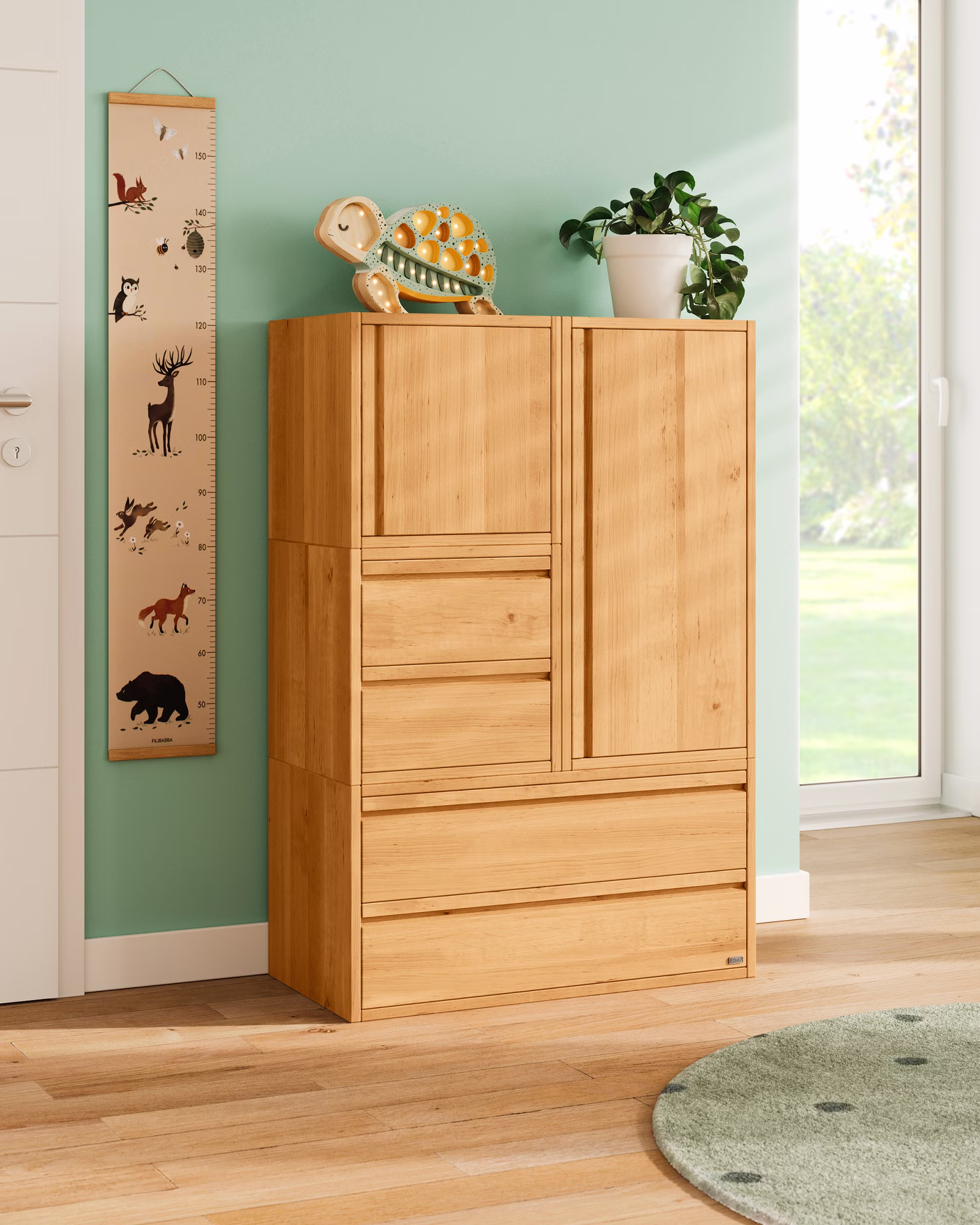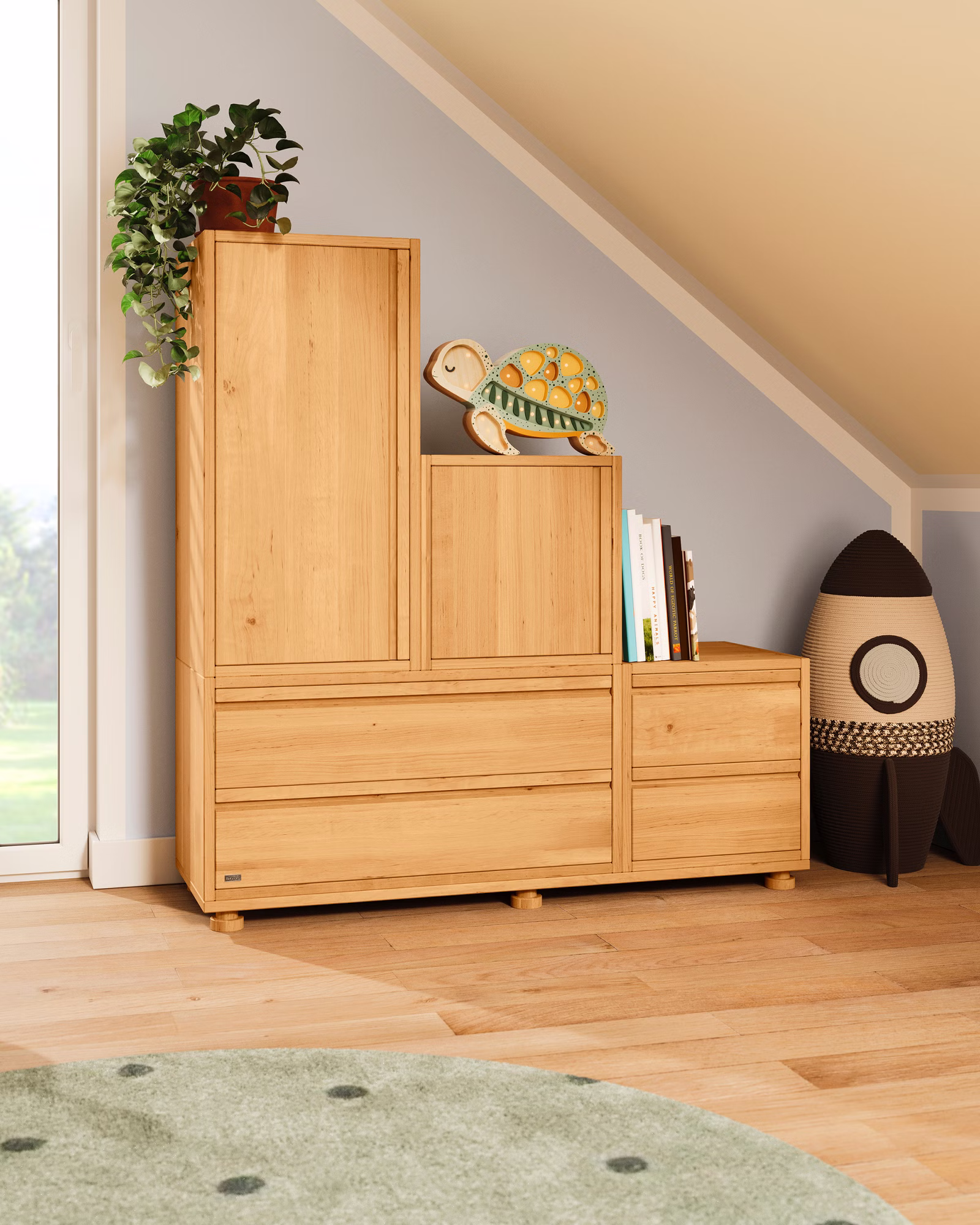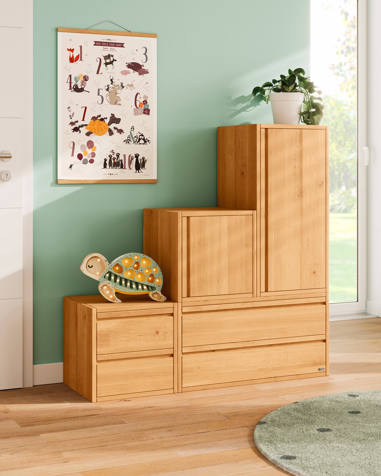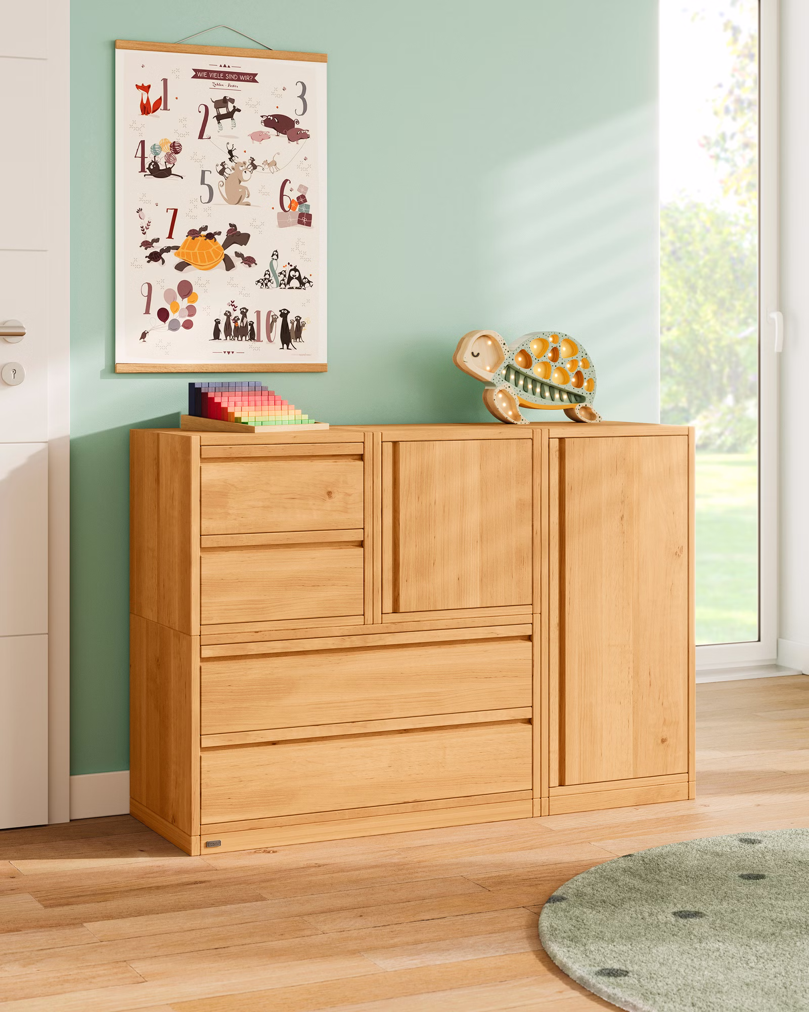 Unser Laura Sideboard wird aus Bio-Massivholz gefertigt und ergänzt jedes Zimmer dank ihrer flexiblen Einsatzmöglichkeiten ideal. Die stufig angeordnete Kommode passt in jeden Raum und findet dabei auch unterhalb von Dachschrägen Platz. Die Kombination aus Regalwürfeln mit Türen und Schubladen sorgt schnell für eine verbesserte Übersichtlichkeit und Ordnung, sodass kleinere und größere Gegenstände bequem verstaut werden können.