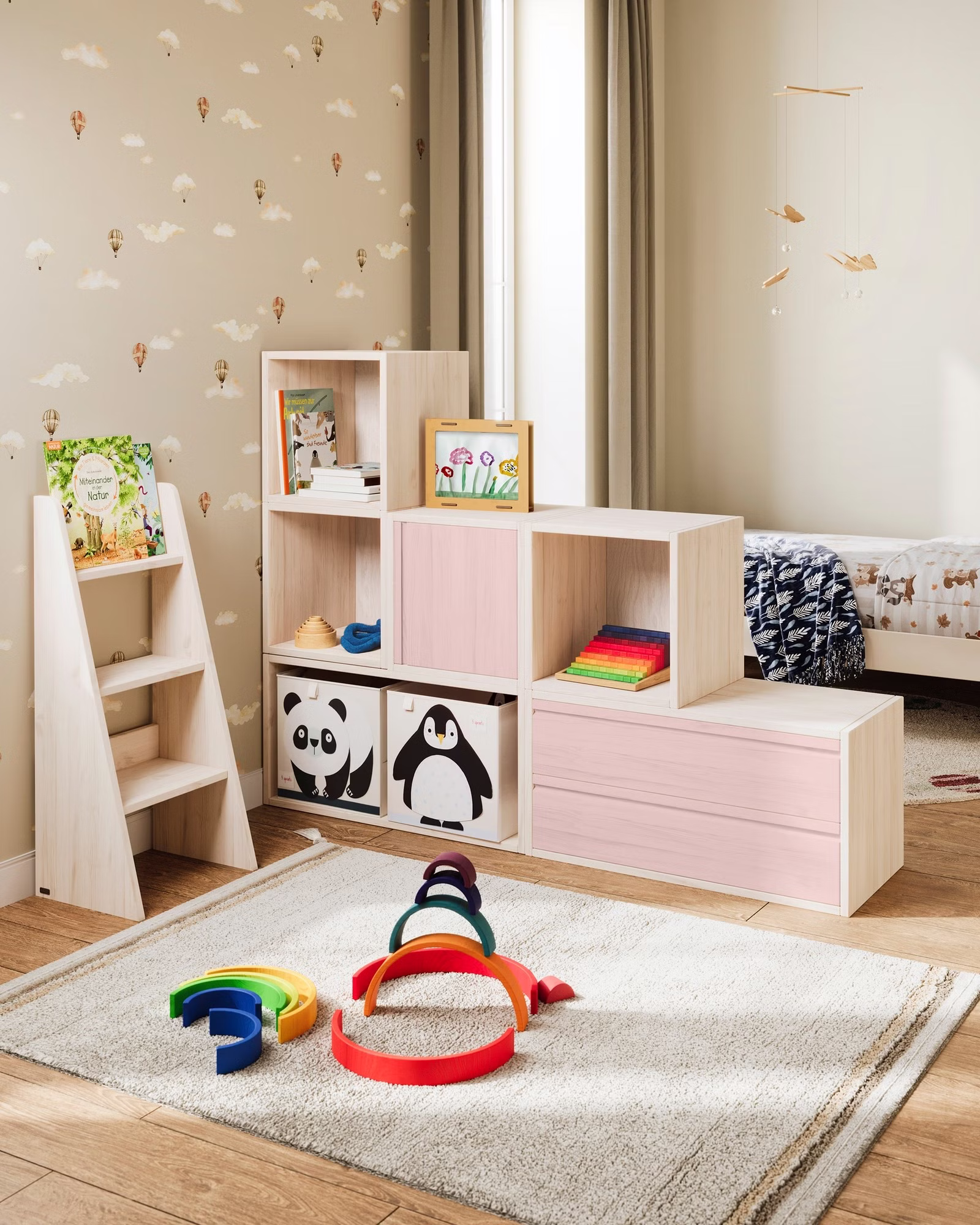 Die Tür des Regalwürfels ist mit Soft-Close-Mechanismus für ein sicheres und geräuscharmes Schließen ausgestattet und sorgt leicht für fröhlich bunte Farbakzente im Zimmer. Die elegant gefräste Griffmulde verleiht dem Regalwürfel dabei einen zeitlos modernen Charakter, der sich harmonisch in jeden Einrichtungsstil einfügt.