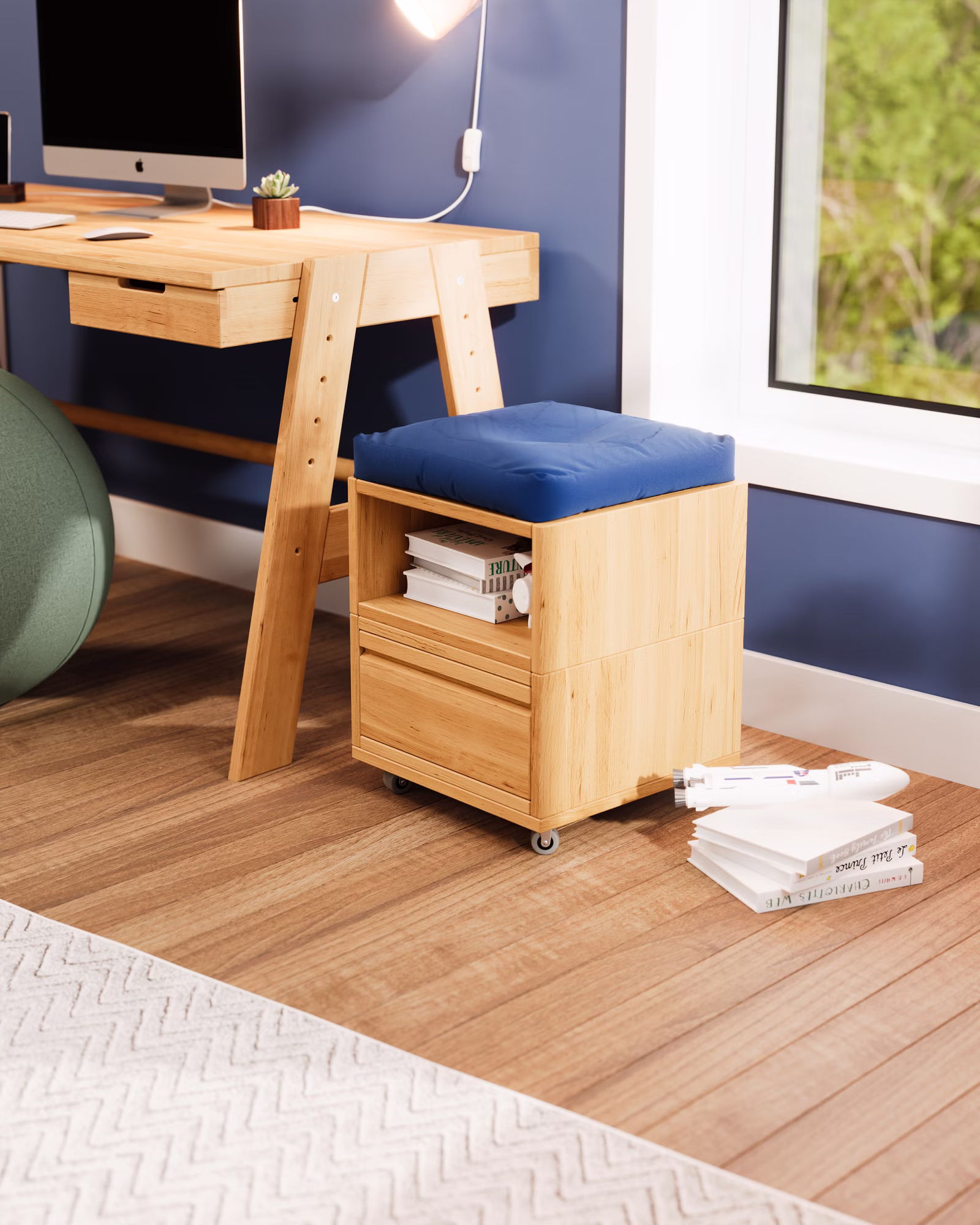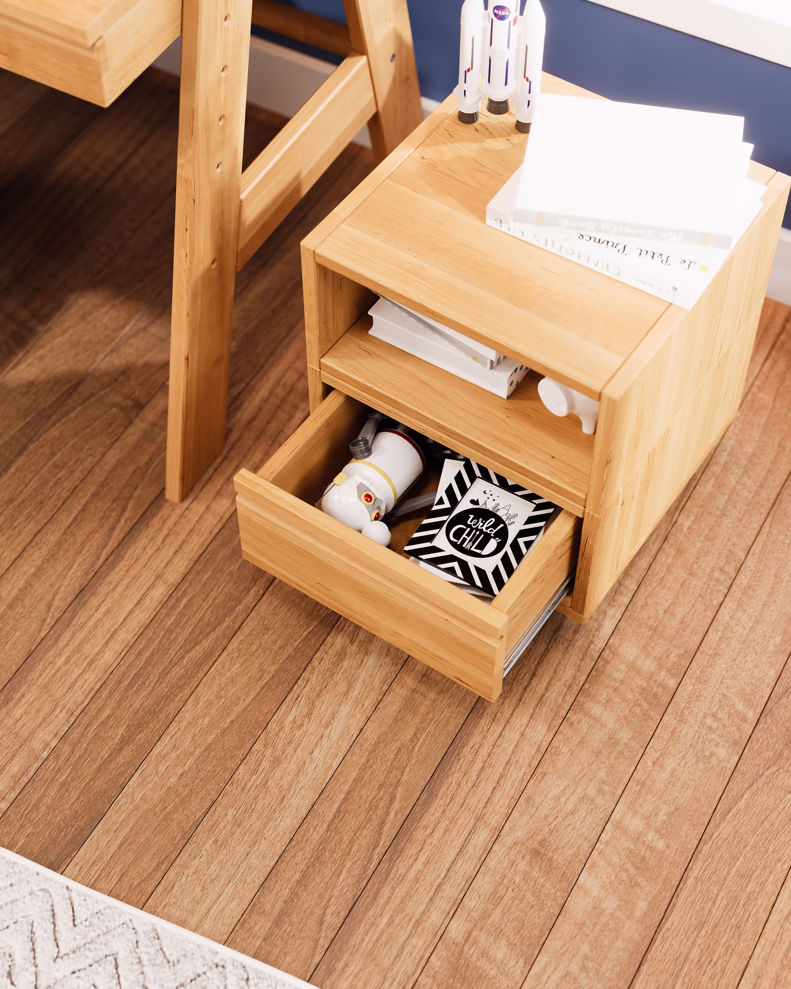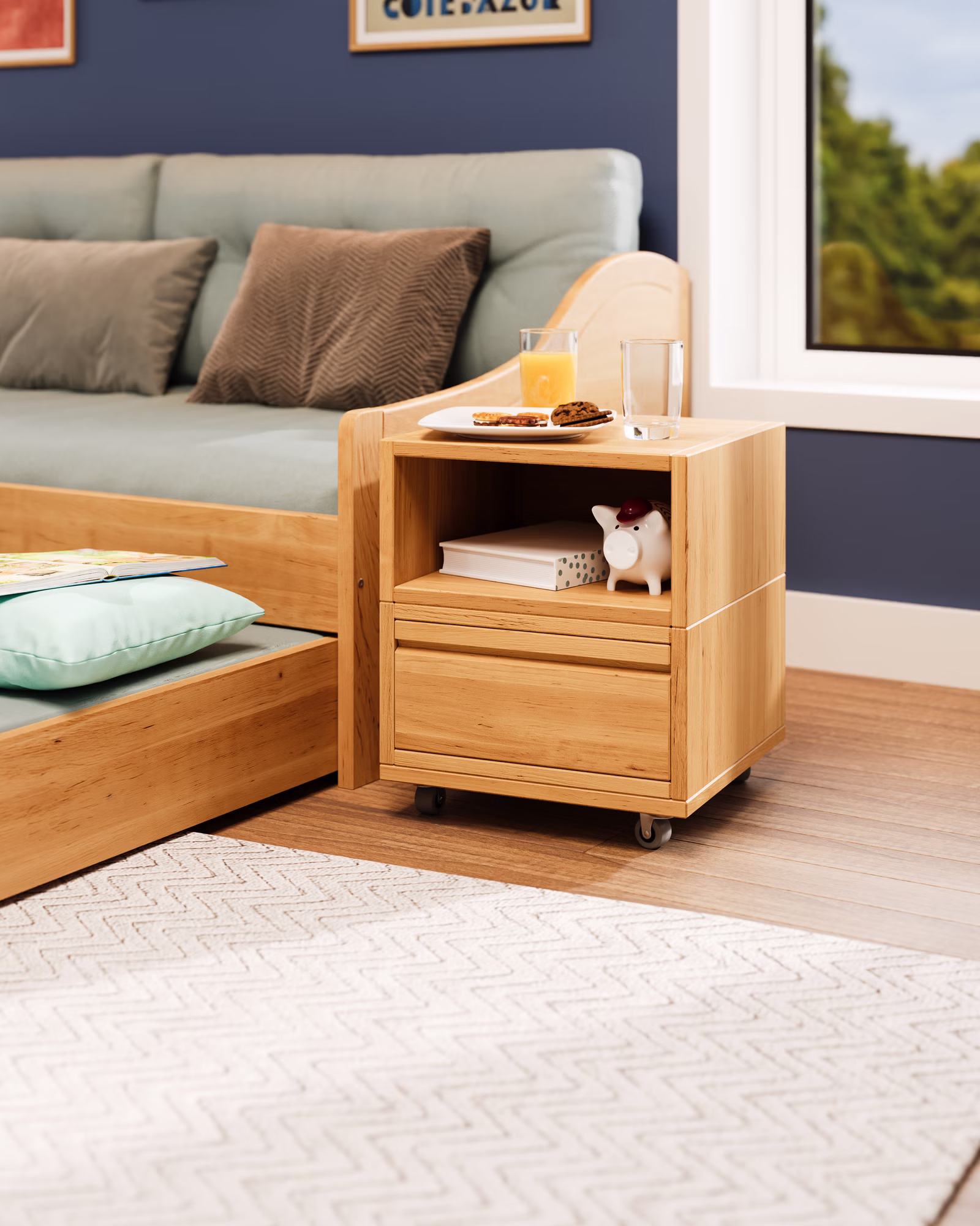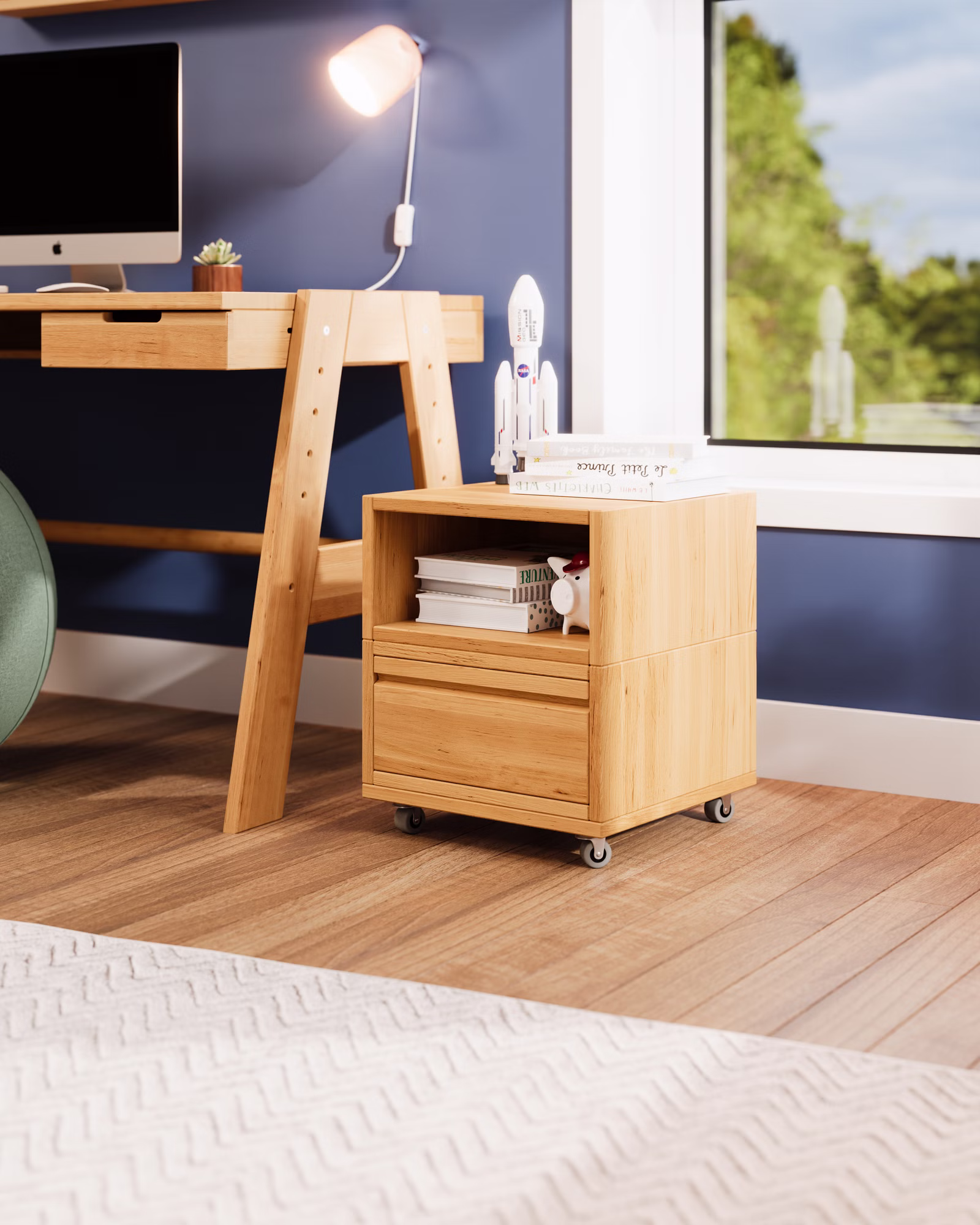 Unser Laura Rollcontainer mit einer Schublade und einem offenen Element wird aus Bio-Massivholz gefertigt und ist die praktische Ergänzung für jeden Schreibtisch im Kinderzimmer oder Büro. Die Schublade kann farblich auf die Einrichtung abgestimmt werden und setzt so fröhliche Farbakzente im Kinderzimmer.