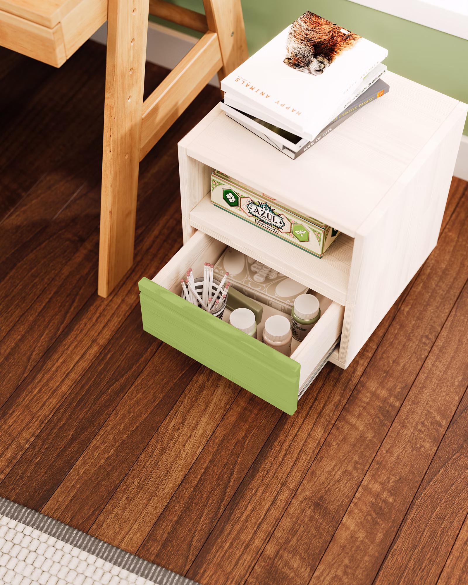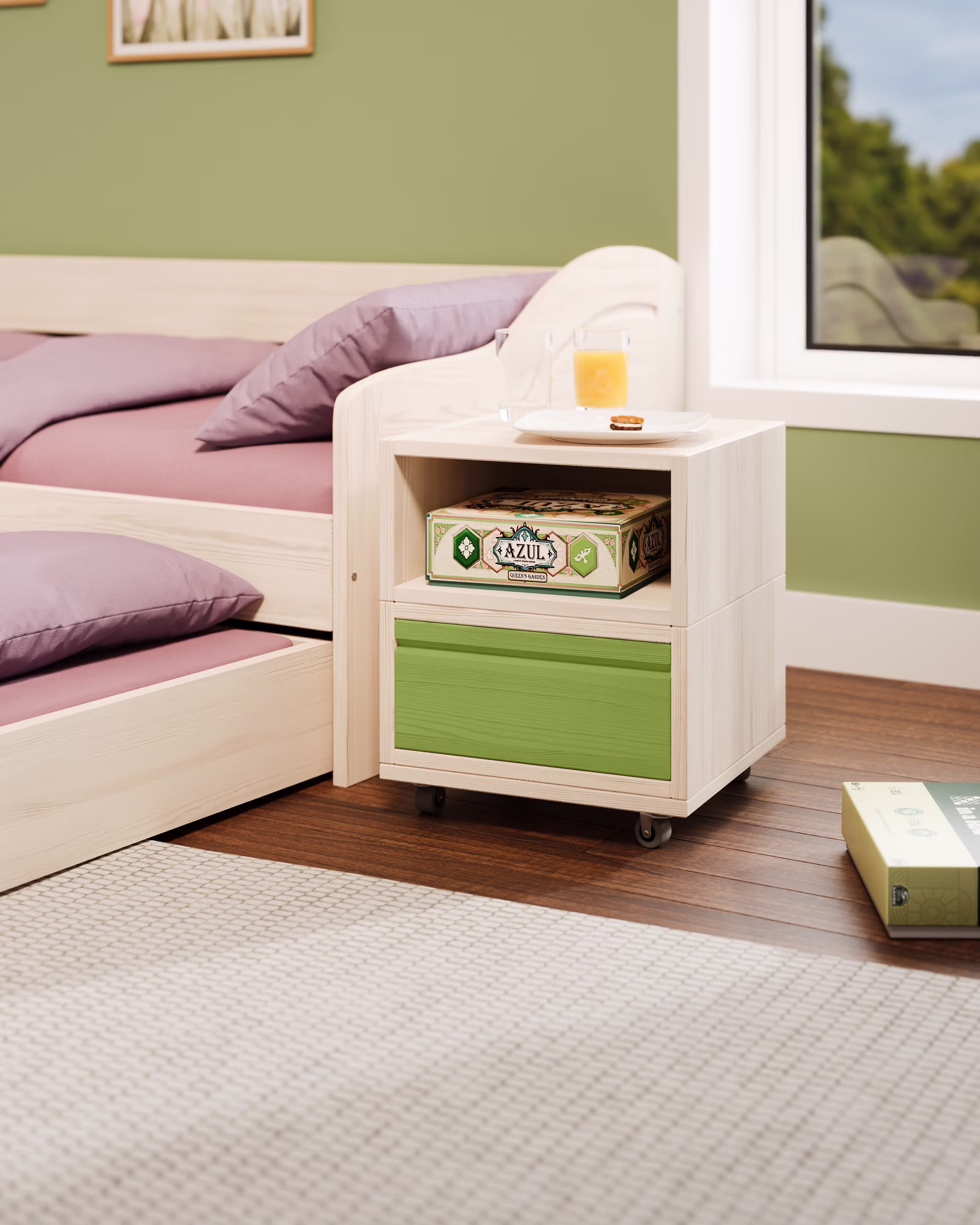 Unser Laura Rollcontainer mit einer Schublade und einem offenen Element wird aus Bio-Massivholz gefertigt und ist die praktische Ergänzung für jeden Schreibtisch im Kinderzimmer oder Büro. Die Schublade kann farblich auf die Einrichtung abgestimmt werden und setzt so fröhliche Farbakzente im Kinderzimmer.