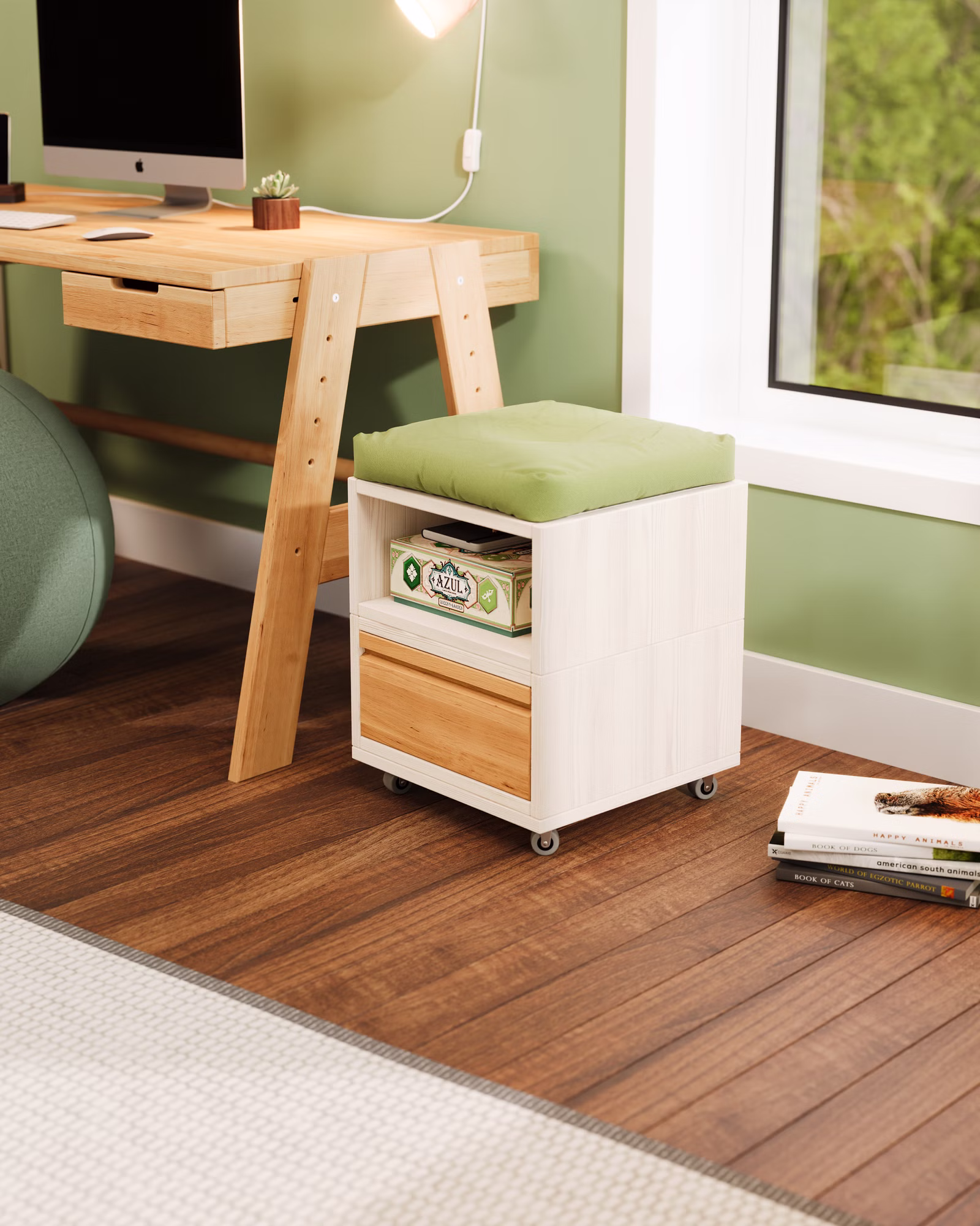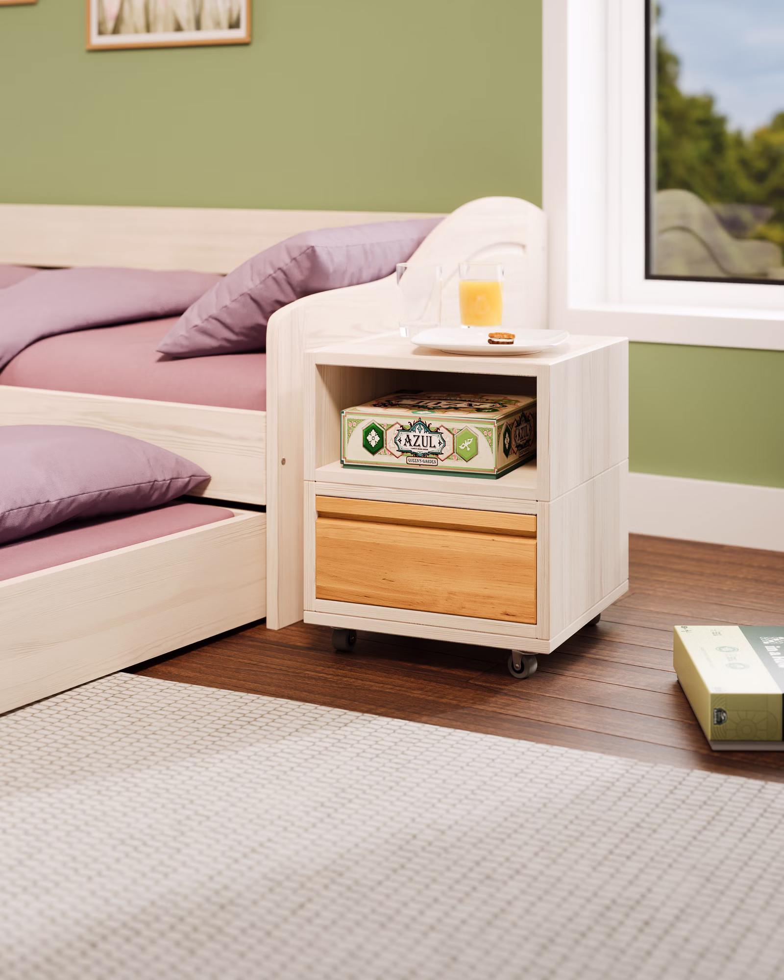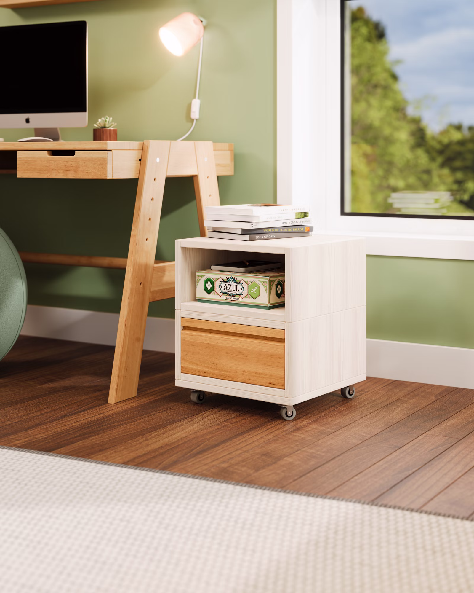 Unser Laura Rollcontainer mit einer Schublade und einem offenen Element wird aus Bio-Massivholz gefertigt und ist die praktische Ergänzung für jeden Schreibtisch im Kinderzimmer oder Büro. Die Schublade kann farblich auf die Einrichtung abgestimmt werden und setzt so fröhliche Farbakzente im Kinderzimmer.
