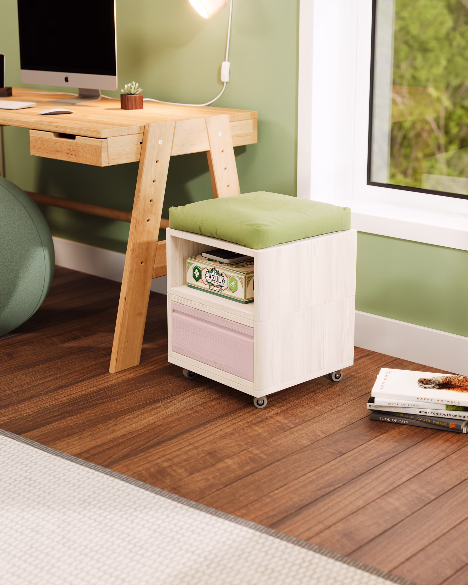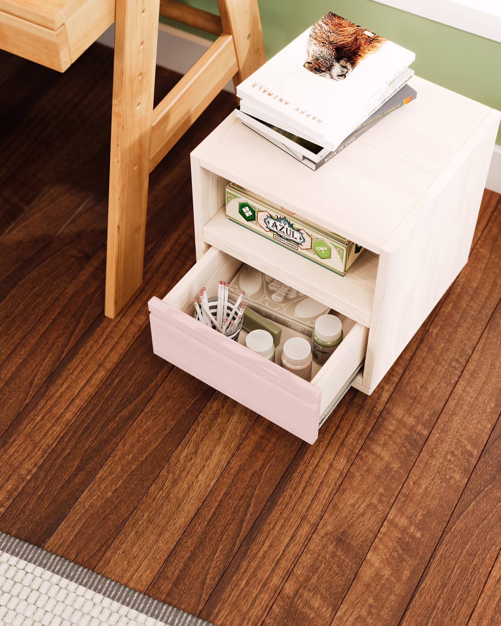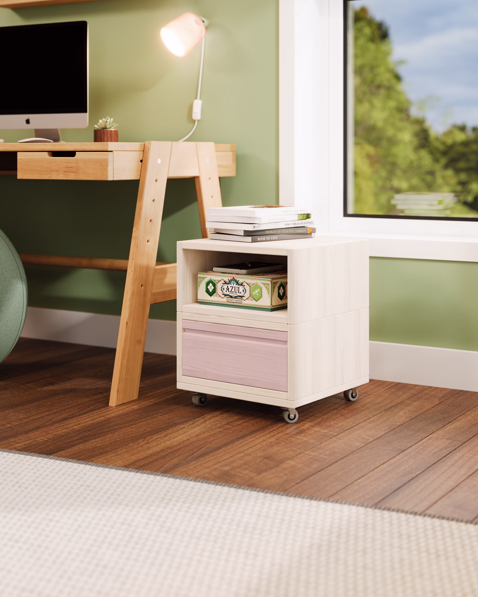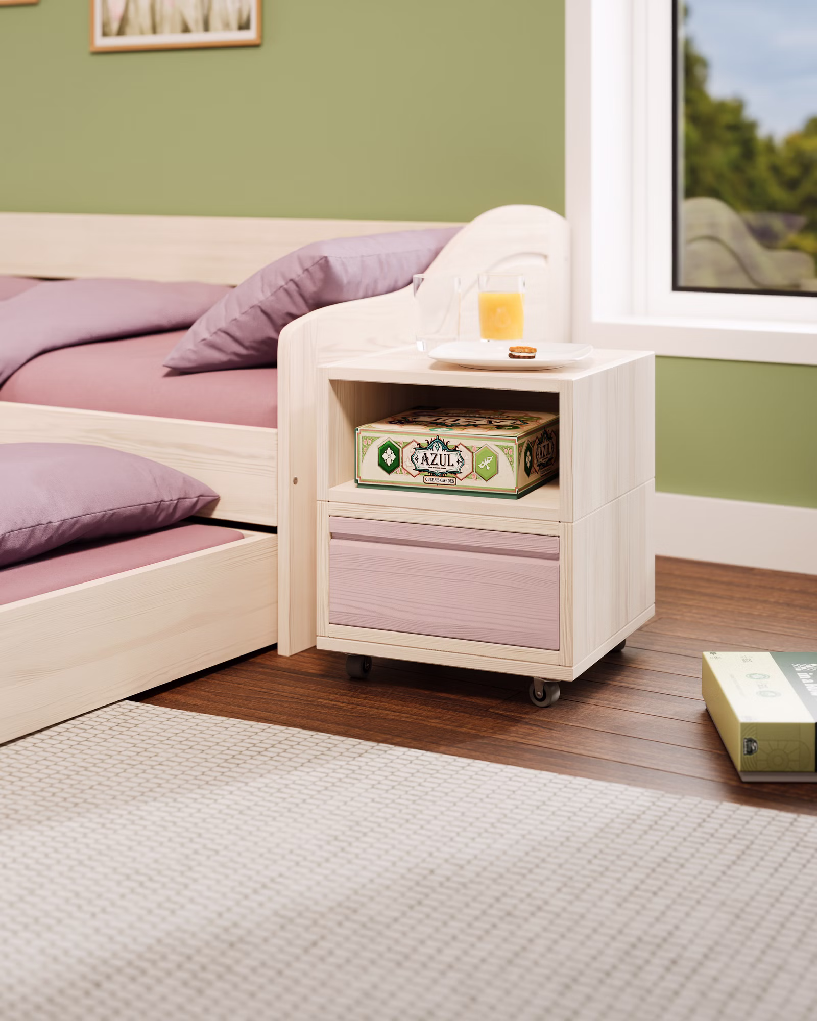 Unser Laura Rollcontainer mit einer Schublade und einem offenen Element wird aus Bio-Massivholz gefertigt und ist die praktische Ergänzung für jeden Schreibtisch im Kinderzimmer oder Büro. Die Schublade kann farblich auf die Einrichtung abgestimmt werden und setzt so fröhliche Farbakzente im Kinderzimmer.