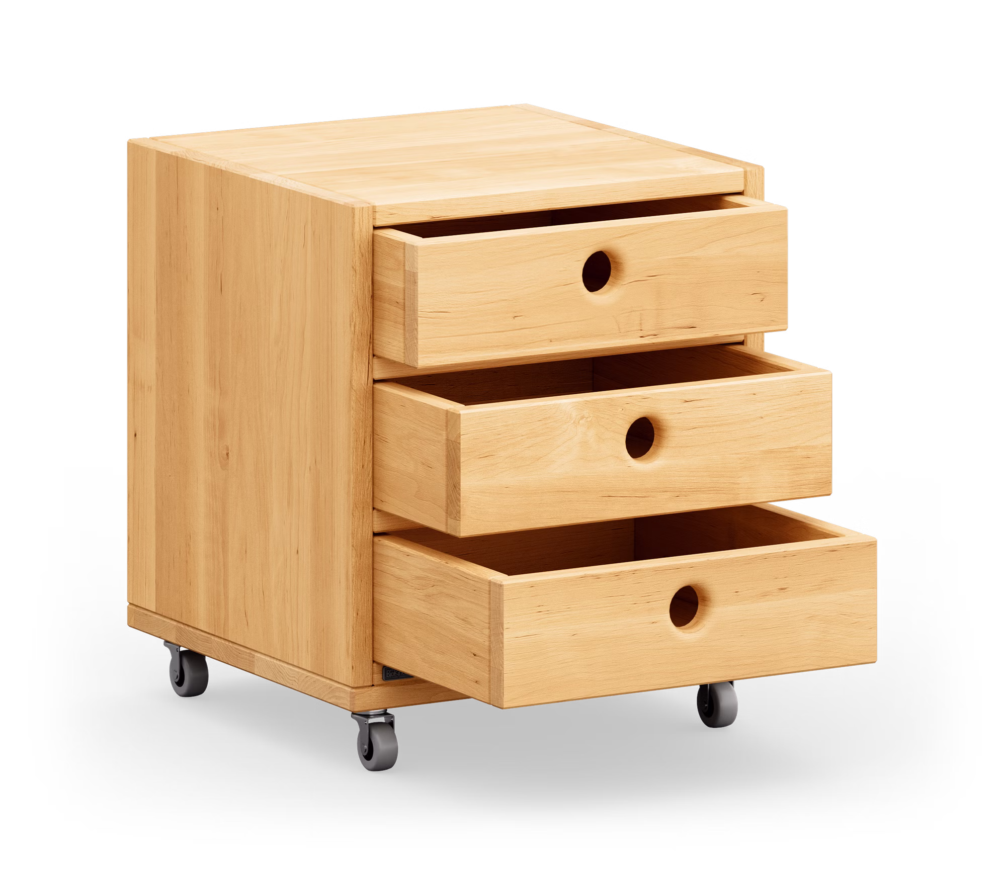 Unser Laura Rollcontainer mit drei Schubladen wird aus Bio-Massivholz gefertigt und ist die praktische Ergänzung für jeden Schreibtisch im Kinderzimmer oder Büro. Die Schubladen können farblich auf die Einrichtung abgestimmt werden und setzen so fröhliche Farbakzente im Kinderzimmer.