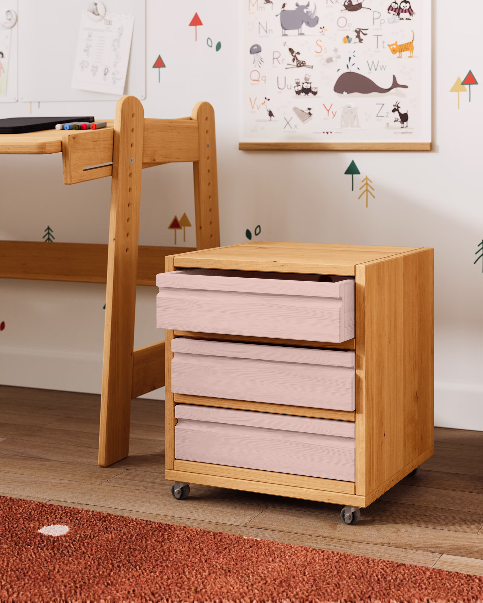 Unser Laura Rollcontainer mit drei Schubladen wird aus Bio-Massivholz gefertigt und ist die praktische Ergänzung für jeden Schreibtisch im Kinderzimmer oder Büro. Die Schubladen können farblich auf die Einrichtung abgestimmt werden und setzen so fröhliche Farbakzente im Kinderzimmer.