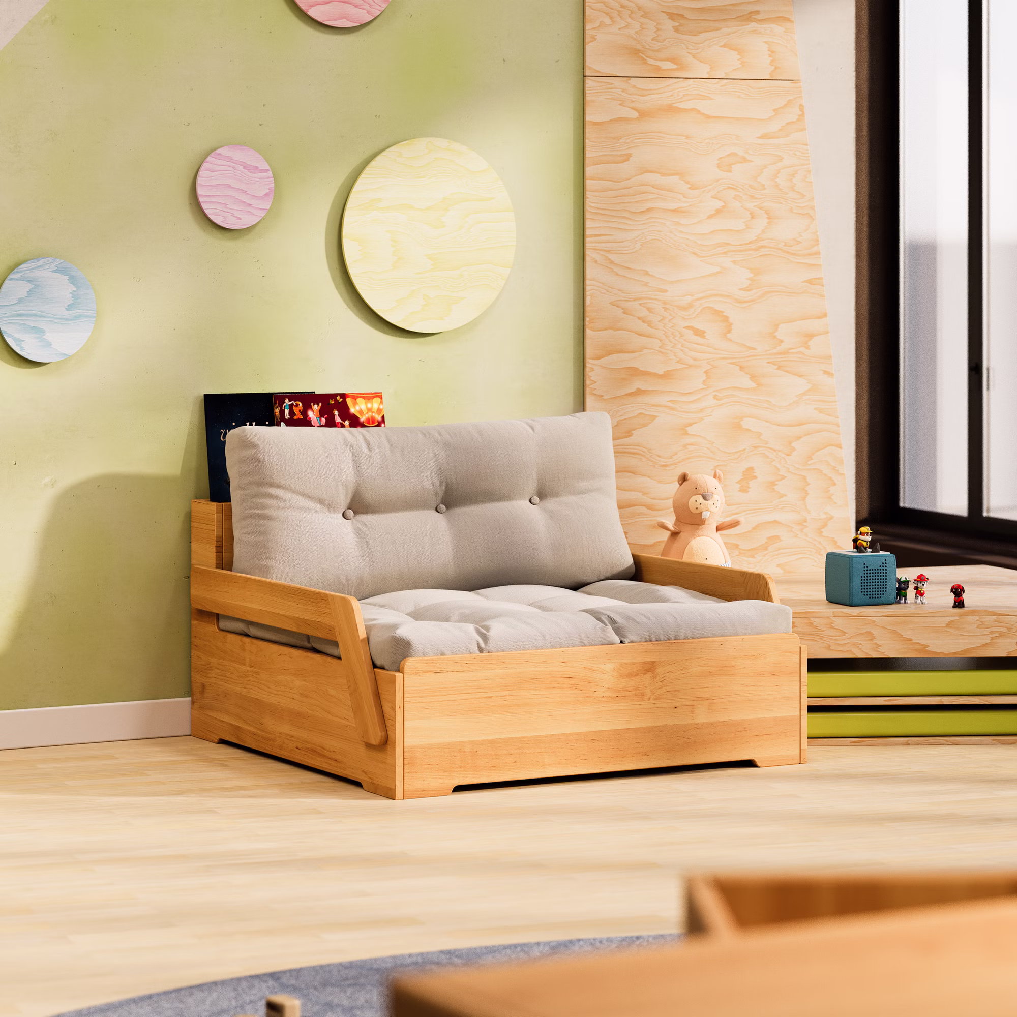 Hier finden Bücher, Lieblingsspielzeug oder andere Schätze ihren Platz – ordentlich verstaut und jederzeit griffbereit. Das Sofaelement ist zudem mit einem stabilen Lattenrost ausgestattet, der für ergonomischen Liegekomfort sorgt – ideal für kleine Ruhepausen oder das tägliche Mittagsschläfchen.