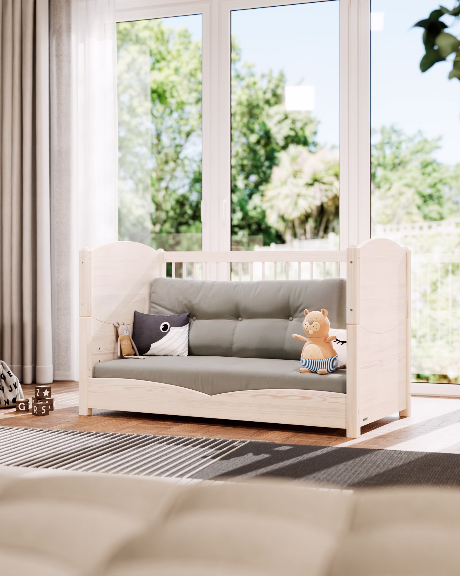 - Babybett Luca 70 x 140: 5-fach verstellbarer Lattenrost, 3 herausnehmbare Schlupfsprossen, variabel umbaubar: auf einer Seite offenes Babybett, offenes Juniorbett, Kindersofa.