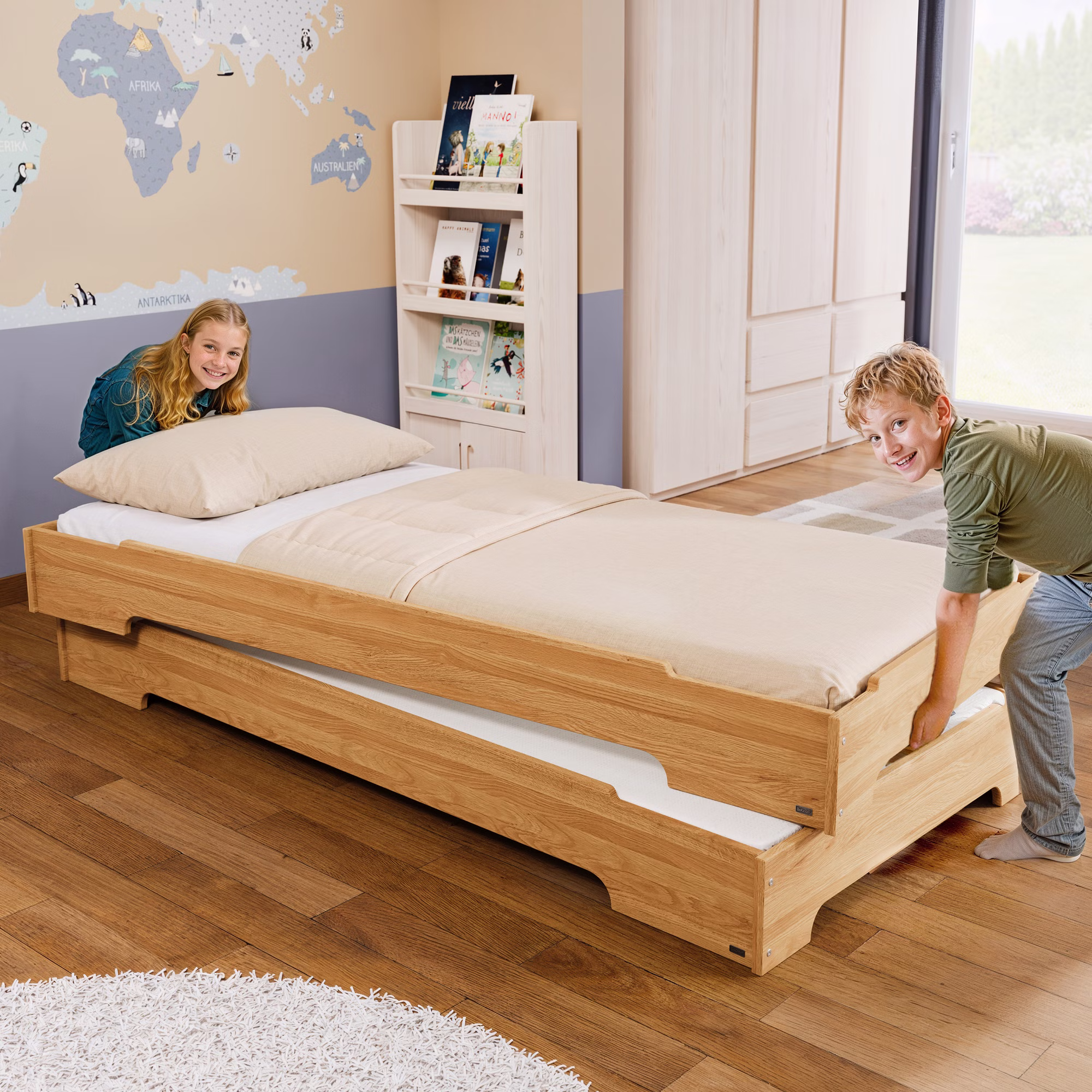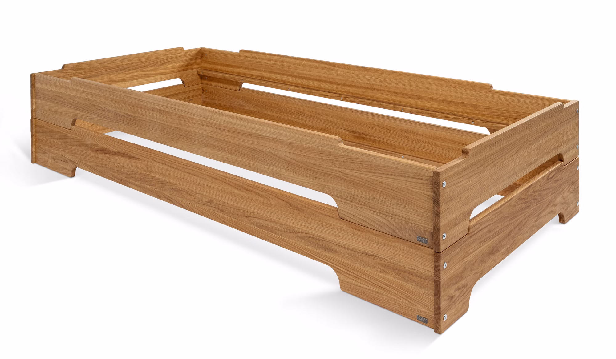 Zudem lässt sich unser Kai Stapelbett auch im Sinne der Montessori-Philosophie als Bodenbett einsetzen. Die Nähe zum Boden ermöglicht eigenständiges Aufstehen und Zubettgehen und fördert so die Autonomie Ihres Kindes. Darüber hinaus bietet ein Bodenbett die Möglichkeit, sich selbstbestimmt und frei zu bewegen. Das Design unseres Kai Bodenbetts sorgt dank der durchdachten Aussparungen außerdem für eine gute Durchlüftung der Bettunterseite und ein angenehmes Schlafklima.