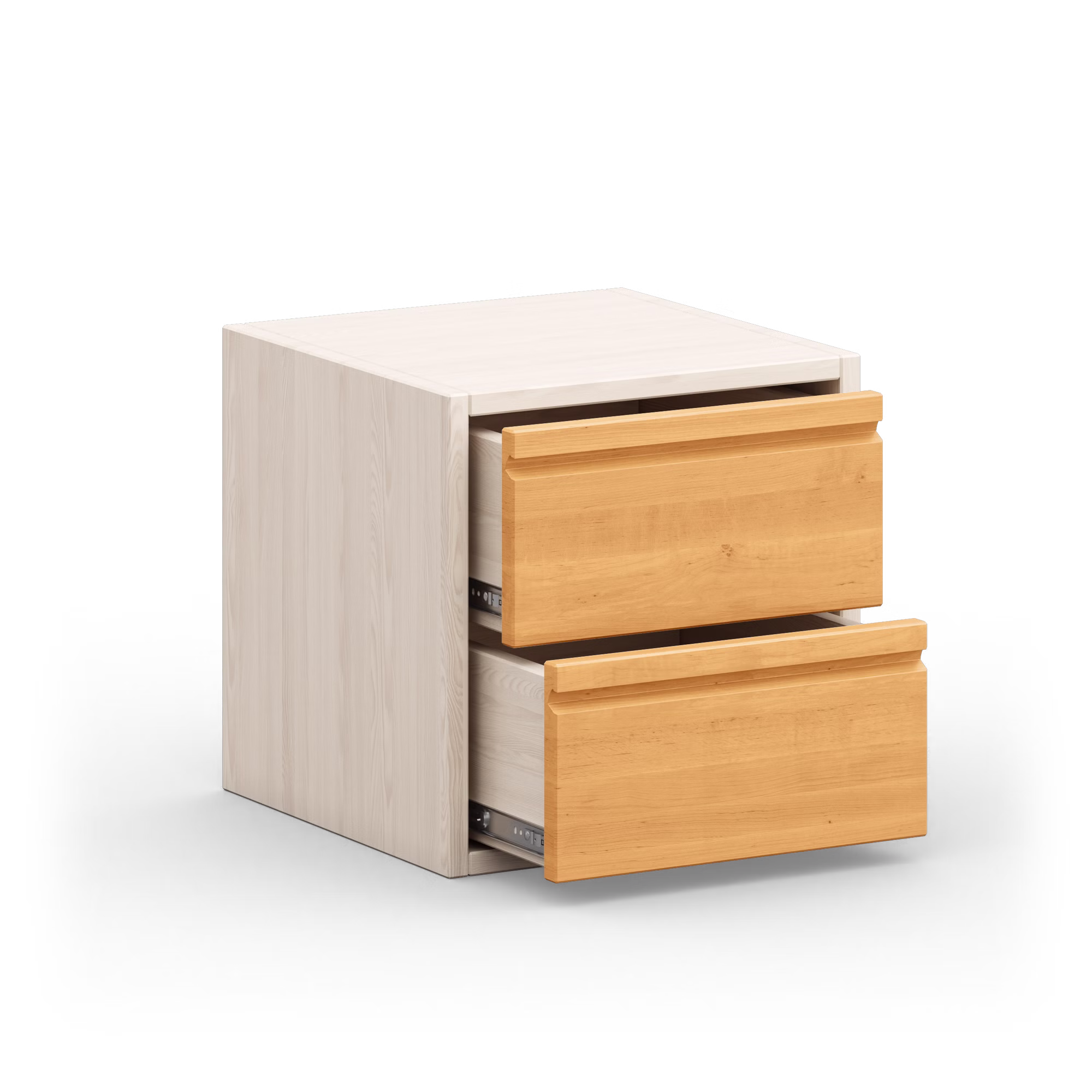 Die beiden Schubladen des Regalwürfels sind mit kugelgelagerten Leichtlaufschienen mit Selbsteinzug ausgestattet. Der integrierte Soft-Close-Mechanismus ermöglicht ein sicheres und geräuscharmes Schließen. Die Schubladen lassen sich voll ausziehen und bieten so Einblicke bis in den hintersten Bereich des Schubkastens.