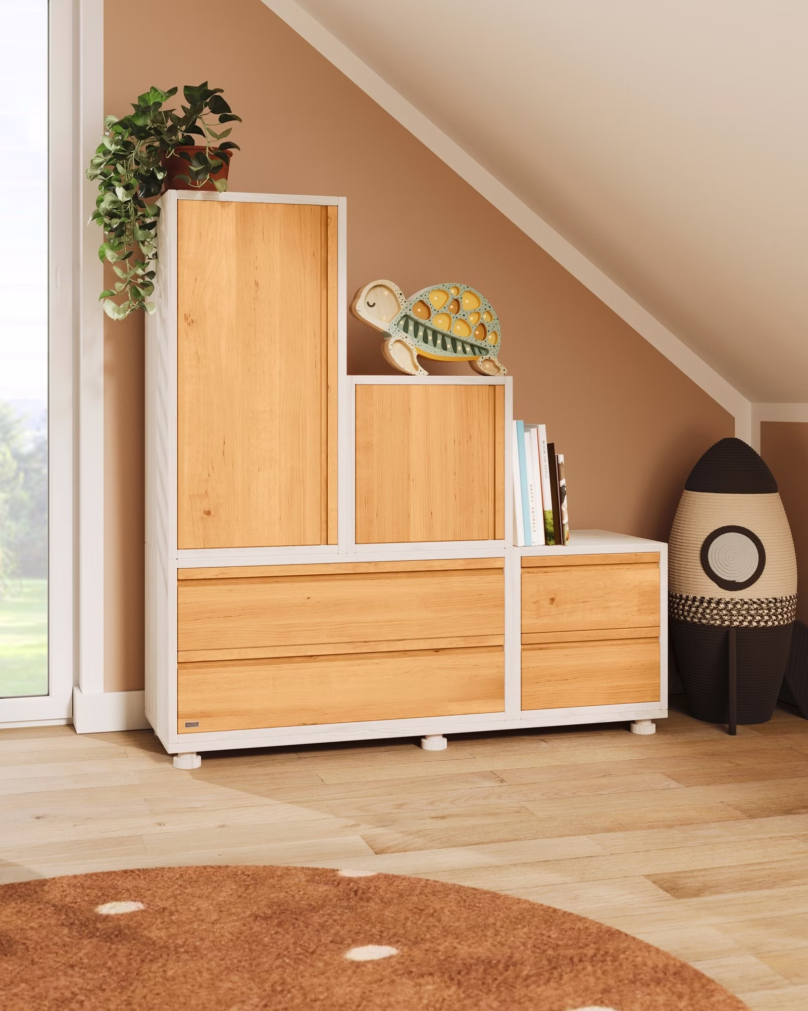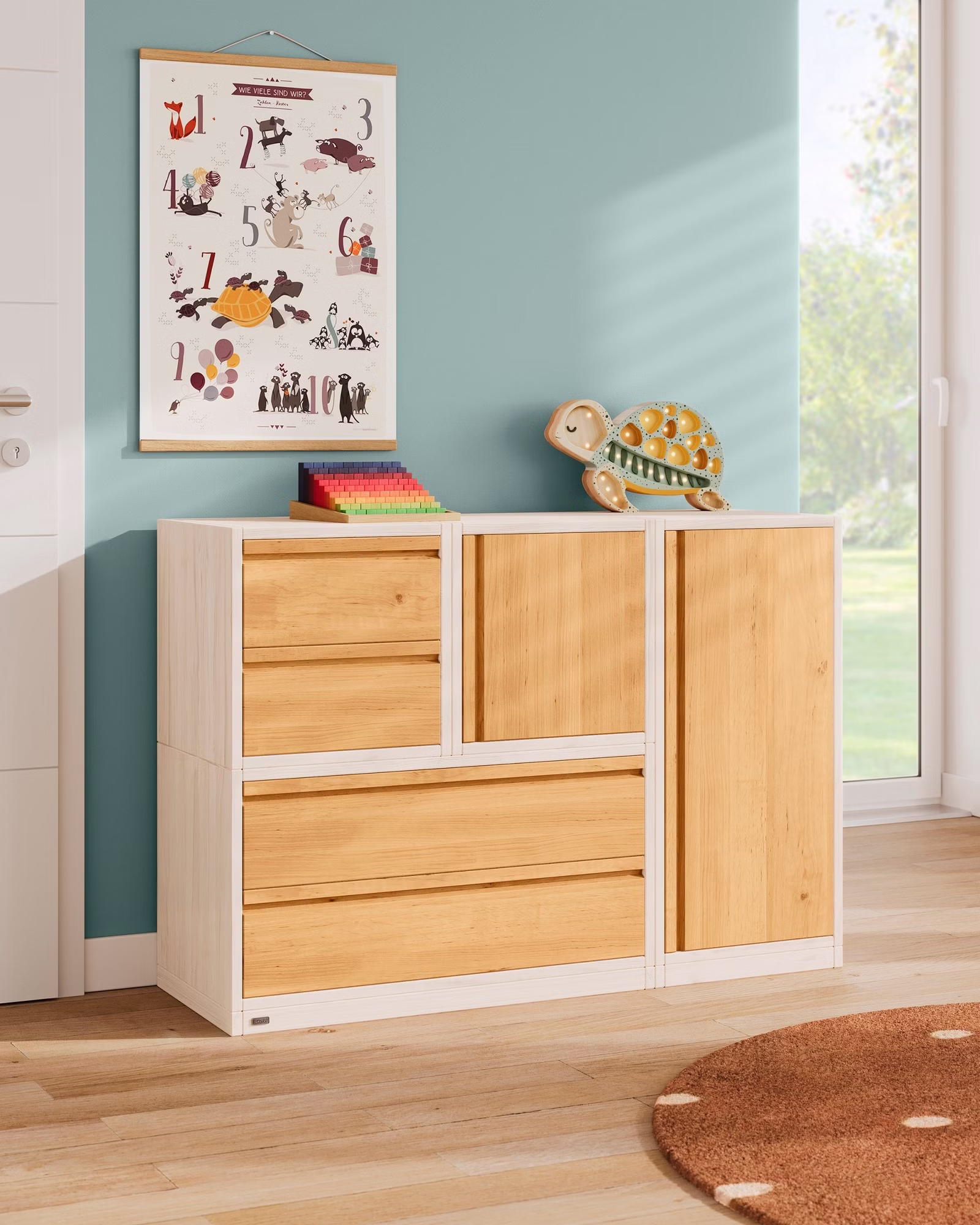 Quadratisch, praktisch… Unser Laura Regalwürfel mit zwei Schubladen wird aus Bio-Massivholz gefertigt und lässt sich vielfältig einsetzen. Kombiniert mit unseren weiteren Laura Regalwürfeln entstehen so individuell gestaltete Raumtrenner, Kommoden oder Regale, die jedes Kinderzimmer ideal ergänzen und dabei auch in Dachschrägen passen. Die eleganten Griffmulden der Schubladen machen unseren Laura Regalwürfel auch optisch zu einem echten Hingucker.