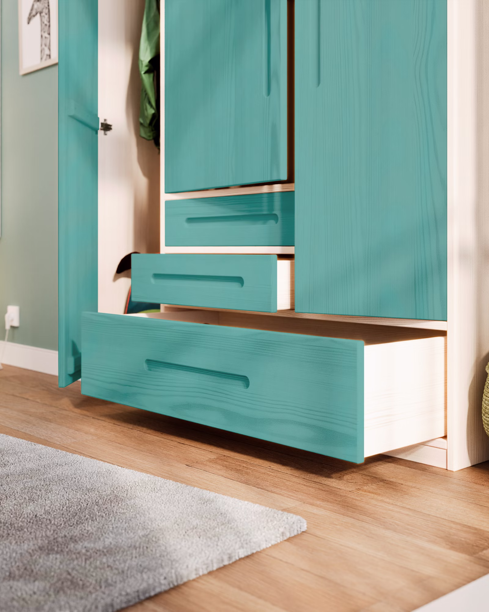 Unser 3-türiger Lina Kleiderschrank wird aus ökologischem Massivholz gefertigt und sorgt dank ausreichendem Platz und einer flexiblen Innenaufteilung schnell für Ordnung und Übersichtlichkeit. Der Kleiderschrank fällt durch sein modernes geometrisches Design und die elegant gefrästen Griffmulden auf. Als Teil unserer zeitlosen Lina Möbelserie fügt sich der Schrank harmonisch in jedes Kinder- und Jugendzimmer ein.