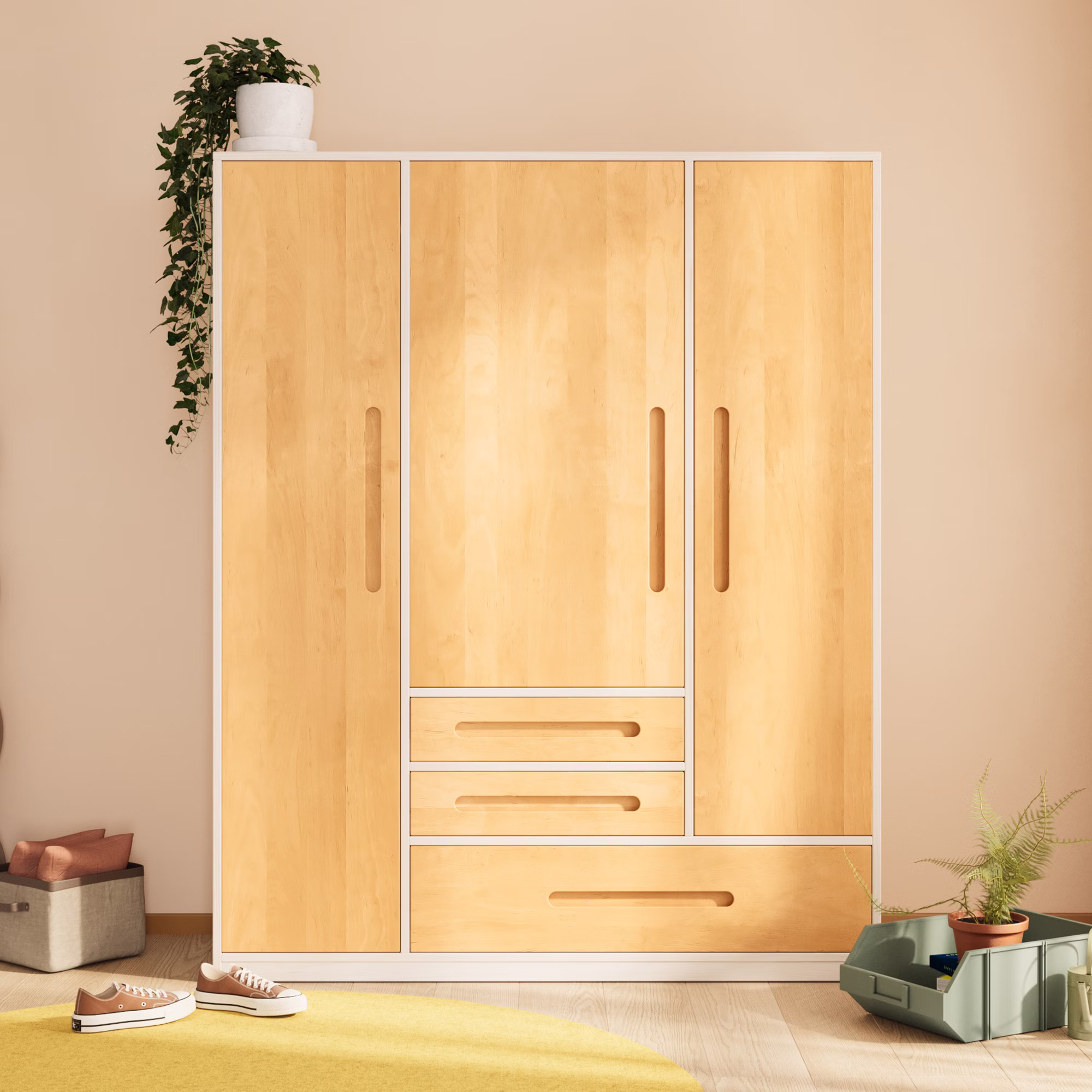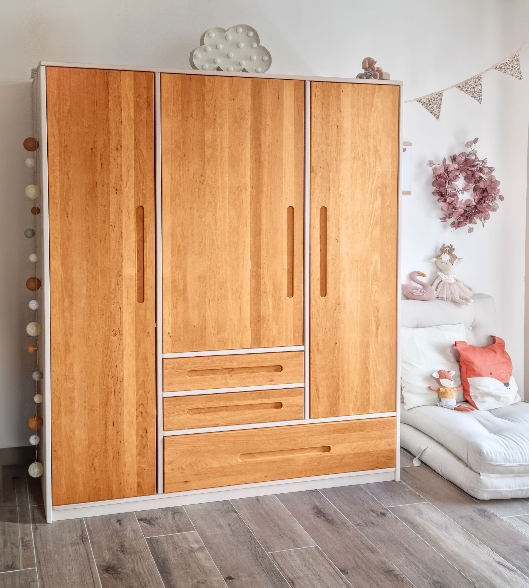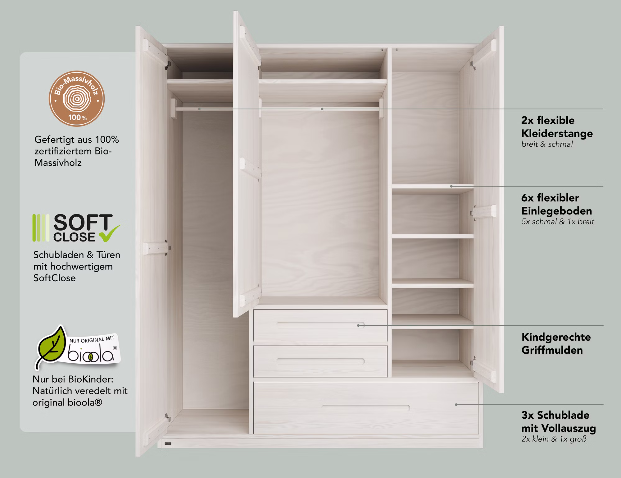 Unser 3-türiger Lina Kleiderschrank wird aus ökologischem Massivholz gefertigt und sorgt dank ausreichendem Platz und einer flexiblen Innenaufteilung schnell für Ordnung und Übersichtlichkeit. Der Kleiderschrank fällt durch sein modernes geometrisches Design und die elegant gefrästen Griffmulden auf. Als Teil unserer zeitlosen Lina Möbelserie fügt sich der Schrank harmonisch in jedes Kinder- und Jugendzimmer ein.