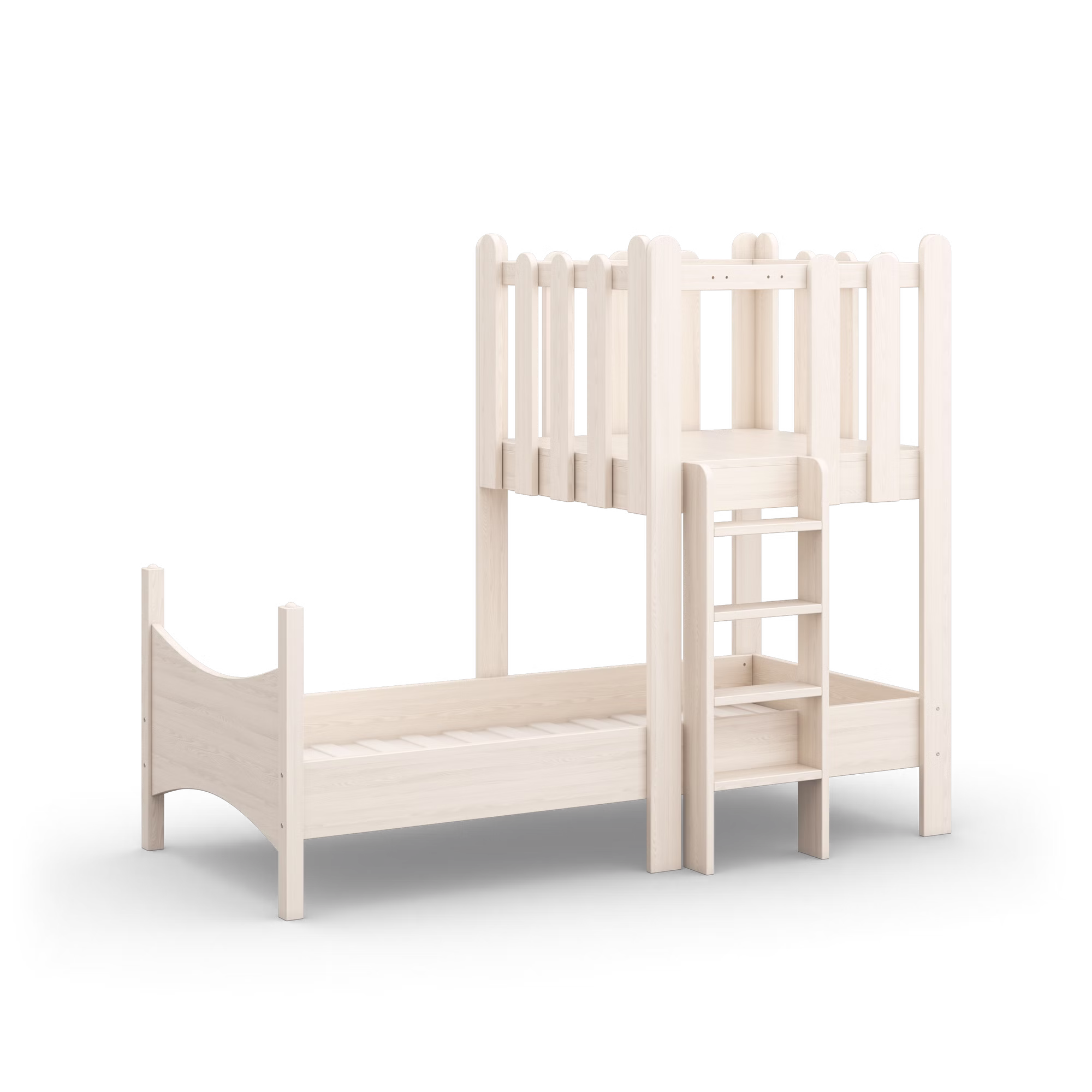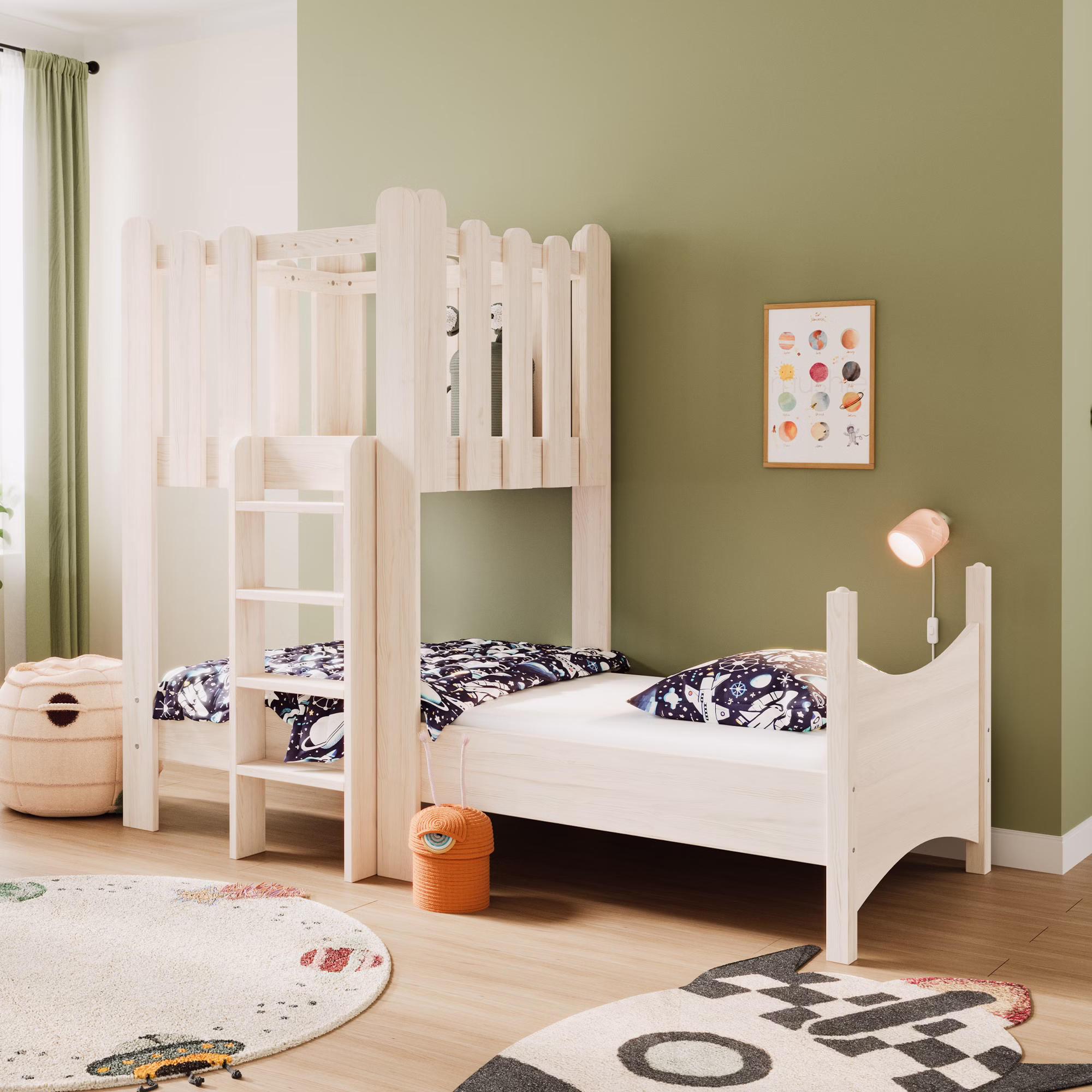 Mit dem Noah Komplett-Set mit Spielturm wird das Kinderzimmer zum tollen Indoor-Spielplatz. Das Bett und der Turm sind aus massivem Bio-Massivholz. Der Spielturm wird sicher und stabil mit dem Bett verbunden und verwandelt das Bett in ein Abenteuerbett, in dem man von tollen Abenteuern träumen kann. Später kann das Bett zu einem frei stehenden Einzelbett oder mit weiteren Elementen zu einem Himmelbett umgebaut werden und ist somit sehr wandelbar.
