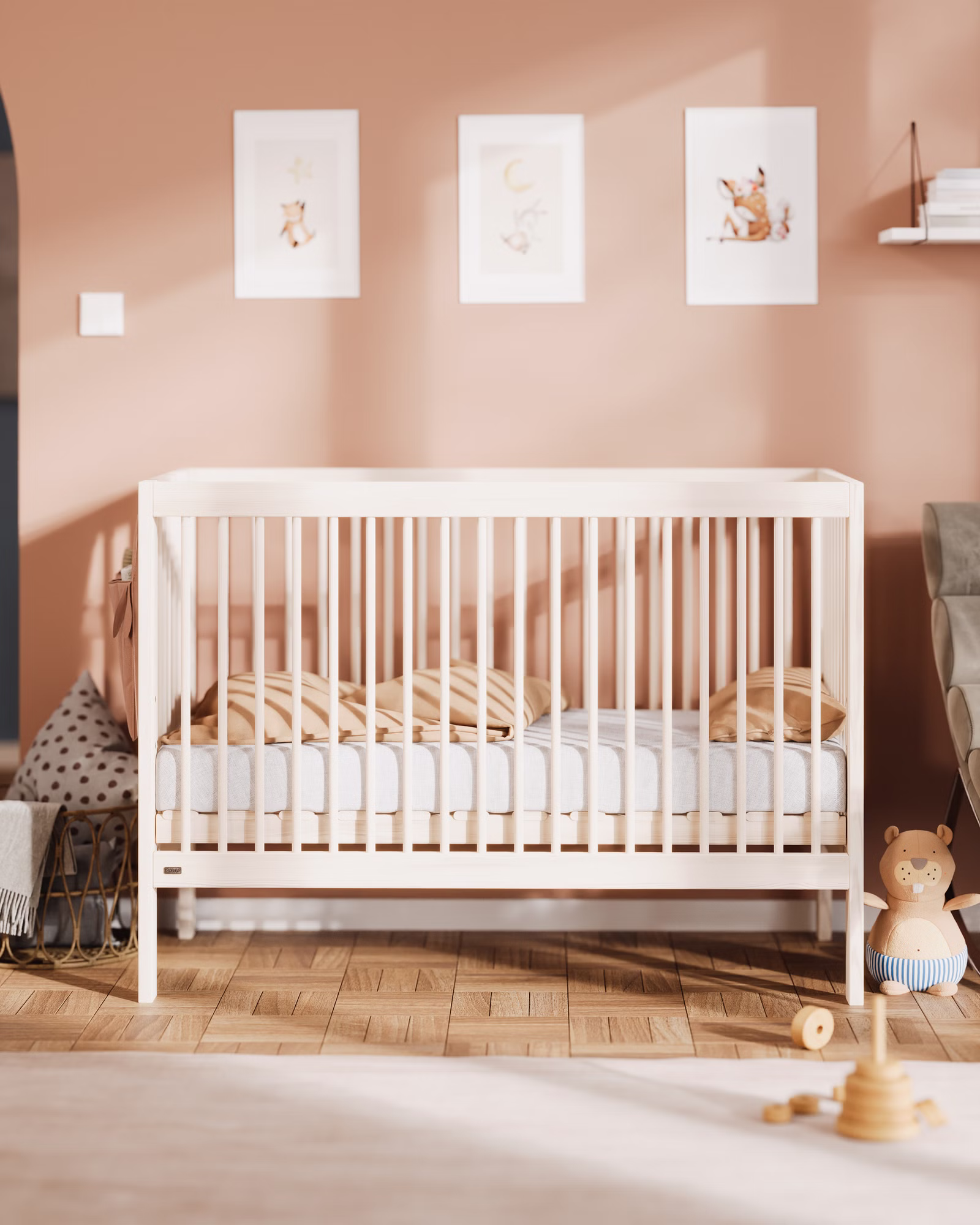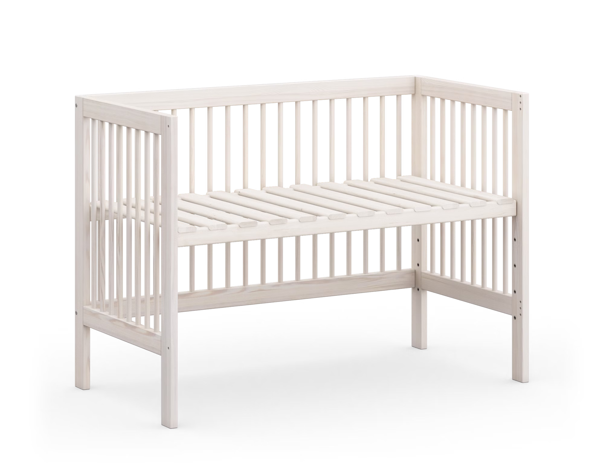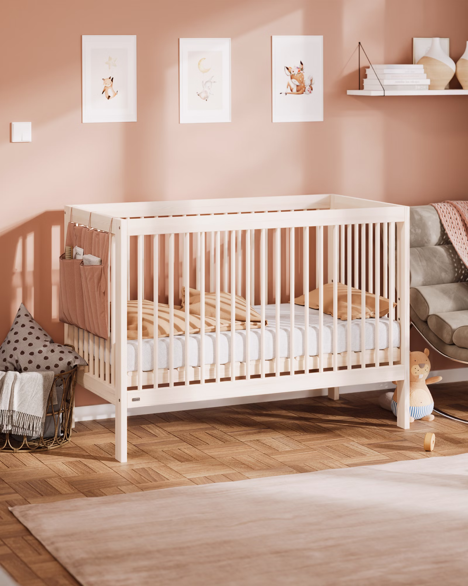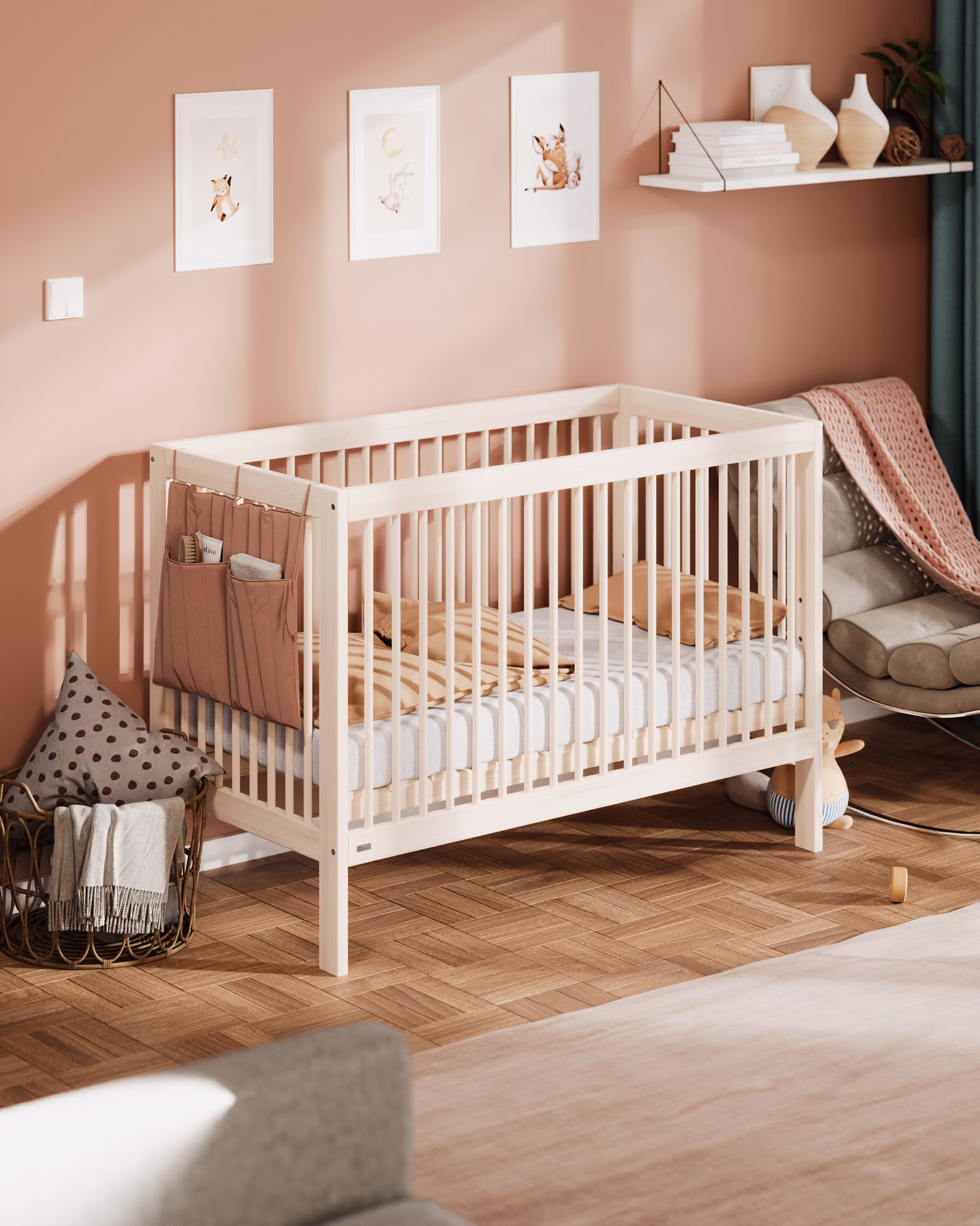 Das Paula Babybett aus Bio-Massivholz vereint durchdachtes Design, Funktionalität und Nachhaltigkeit. Dieses Bett ist perfekt für kleinere Kinderzimmer und das Elternschlafzimmer und verfügt über praktische Funktionen: