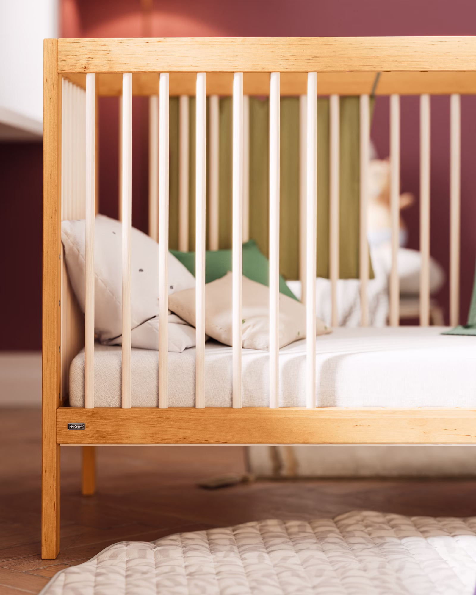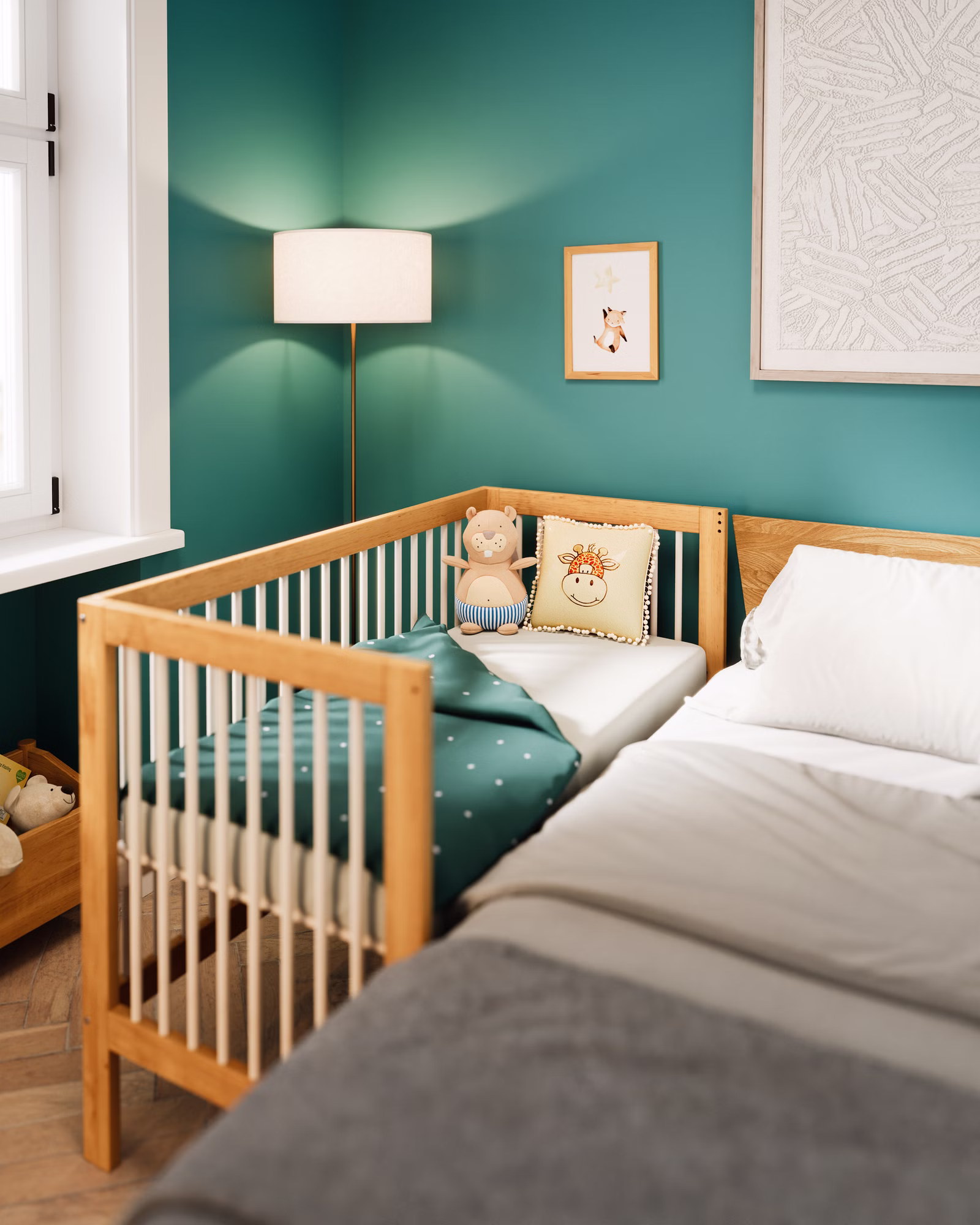 Das Paula Babybett aus Bio-Massivholz vereint durchdachtes Design, Funktionalität und Nachhaltigkeit. Dieses Bett ist perfekt für kleinere Kinderzimmer und das Elternschlafzimmer und verfügt über praktische Funktionen:
