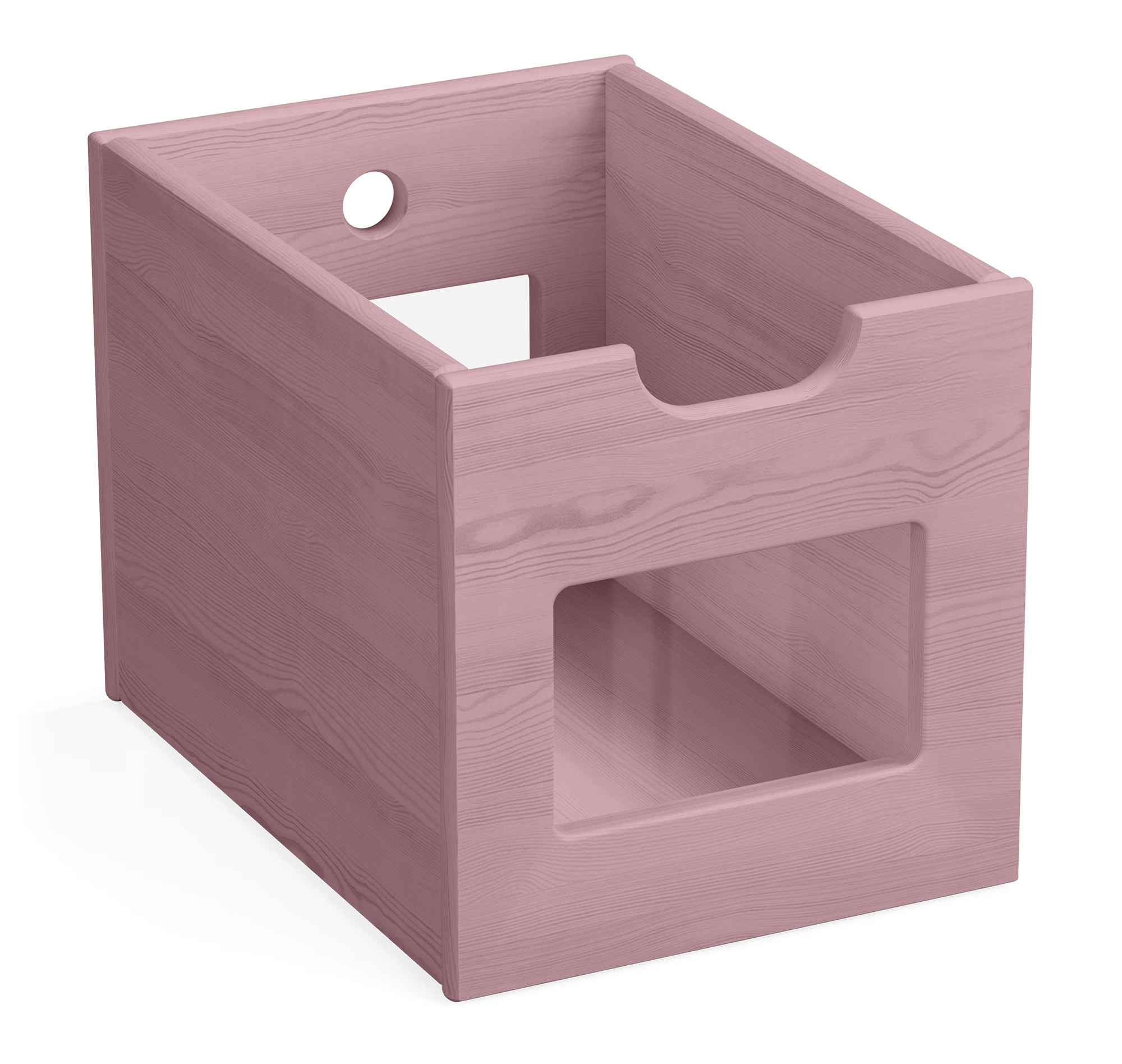 Die Box hat vorne eine elegant gefräste Griffmulde und hinten ein funktionales Griffloch; beidseitig benutzbar. Passend zu allen Robin Regalen und Robin Rollregalen.