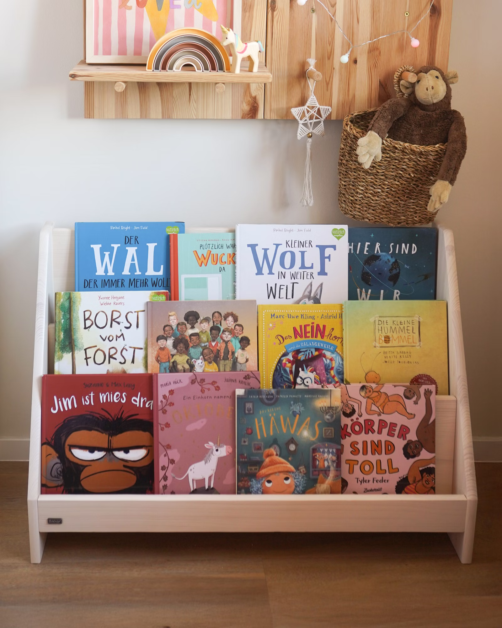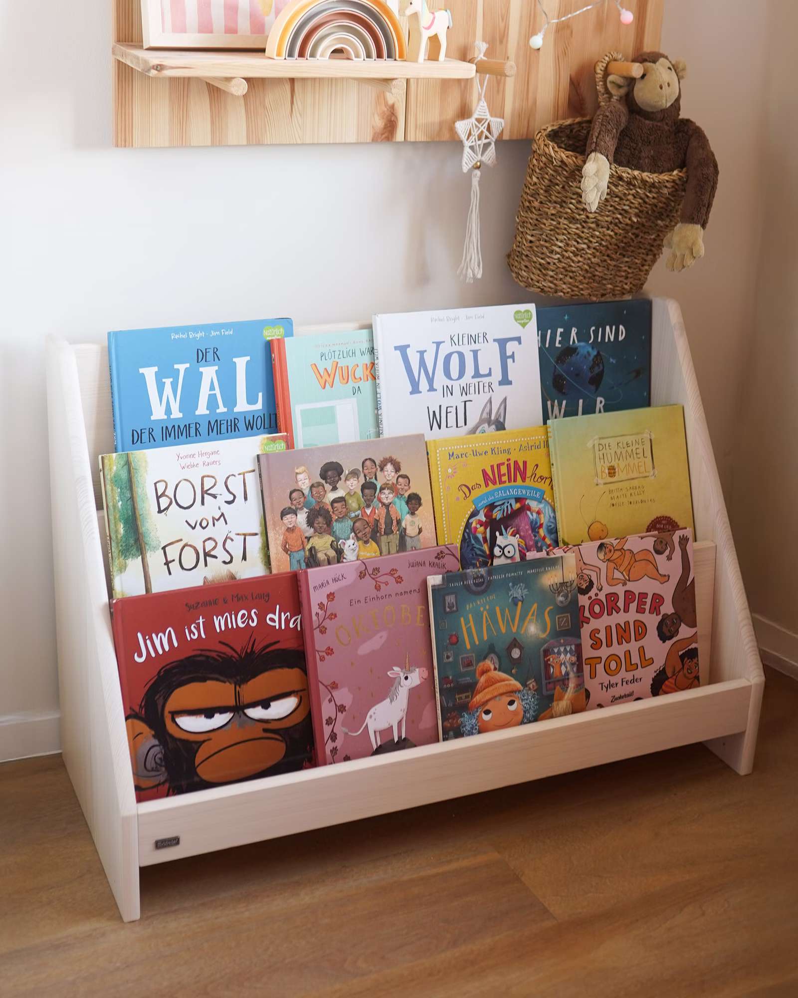 Das Robin Bücherregal kompakt ist eine wunderbare Lösung für Kindertagesstätten ebenso wie für den Einsatz zu Hause. Gefertigt aus nachhaltigem Massivholz, lässt es sich frei im Raum platzieren – ideal zum Spielen und Stöbern. Auf der Vorderseite laden großzügige Fächer dazu ein, Bücher aller Größen mit dem Cover nach vorne zu präsentieren – perfekt, um Kinder zum Entdecken, Auswählen und gemeinsamen Lesen zu motivieren. Selbst großformatige Wimmelbücher finden hier mühelos ihren Platz.
