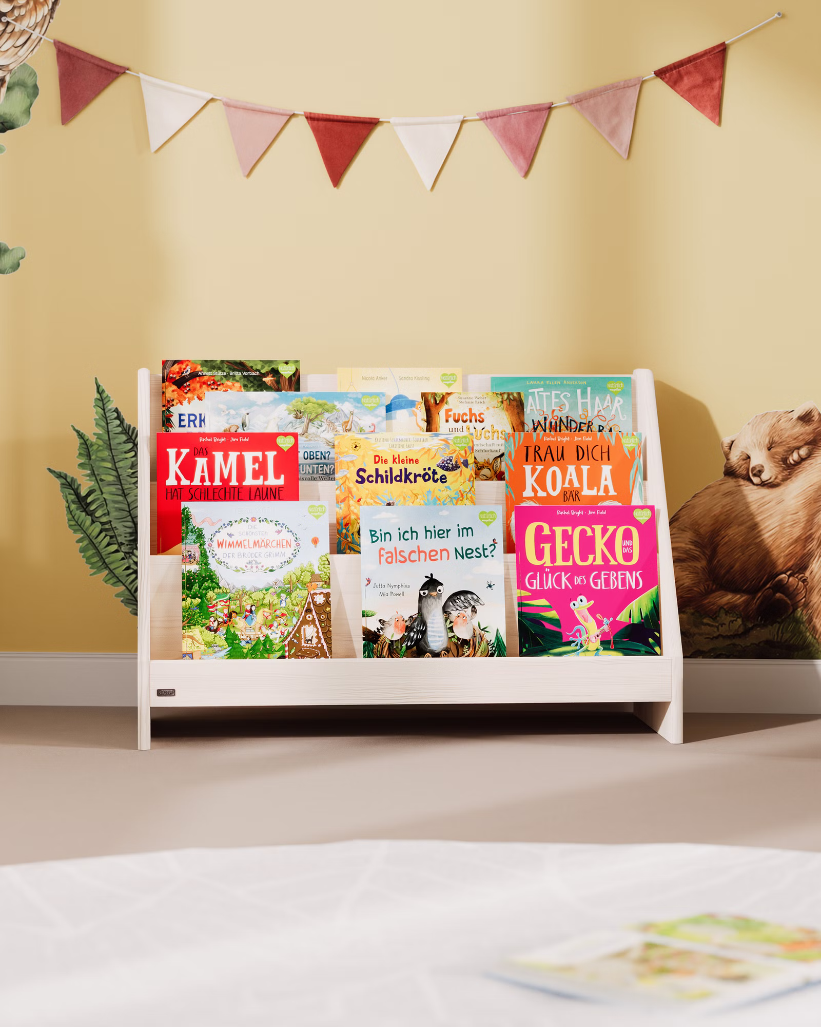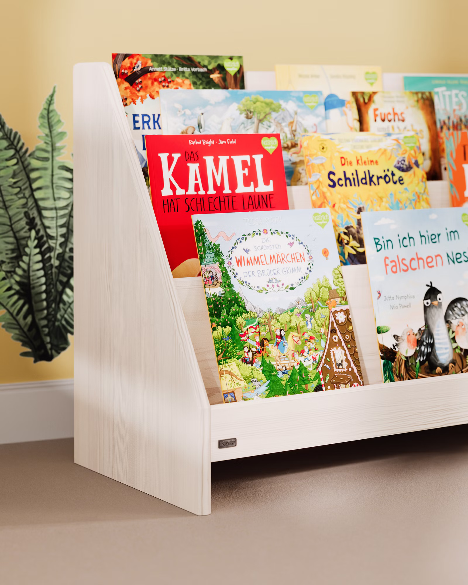 Das Robin Bücherregal kompakt ist eine wunderbare Lösung für Kindertagesstätten ebenso wie für den Einsatz zu Hause. Gefertigt aus nachhaltigem Massivholz, lässt es sich frei im Raum platzieren  – ideal zum Spielen und Stöbern. Auf der Vorderseite laden großzügige Fächer dazu ein, Bücher aller Größen mit dem Cover nach vorne zu präsentieren – perfekt, um Kinder zum Entdecken, Auswählen und gemeinsamen Lesen zu motivieren. Selbst großformatige Wimmelbücher finden hier mühelos ihren Platz.