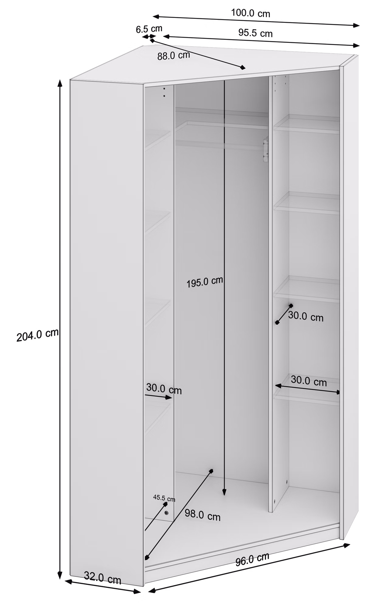 H 204 cm x B 96 cm, T 32 cm bzw. 100 cm (siehe Maßzeichnung)