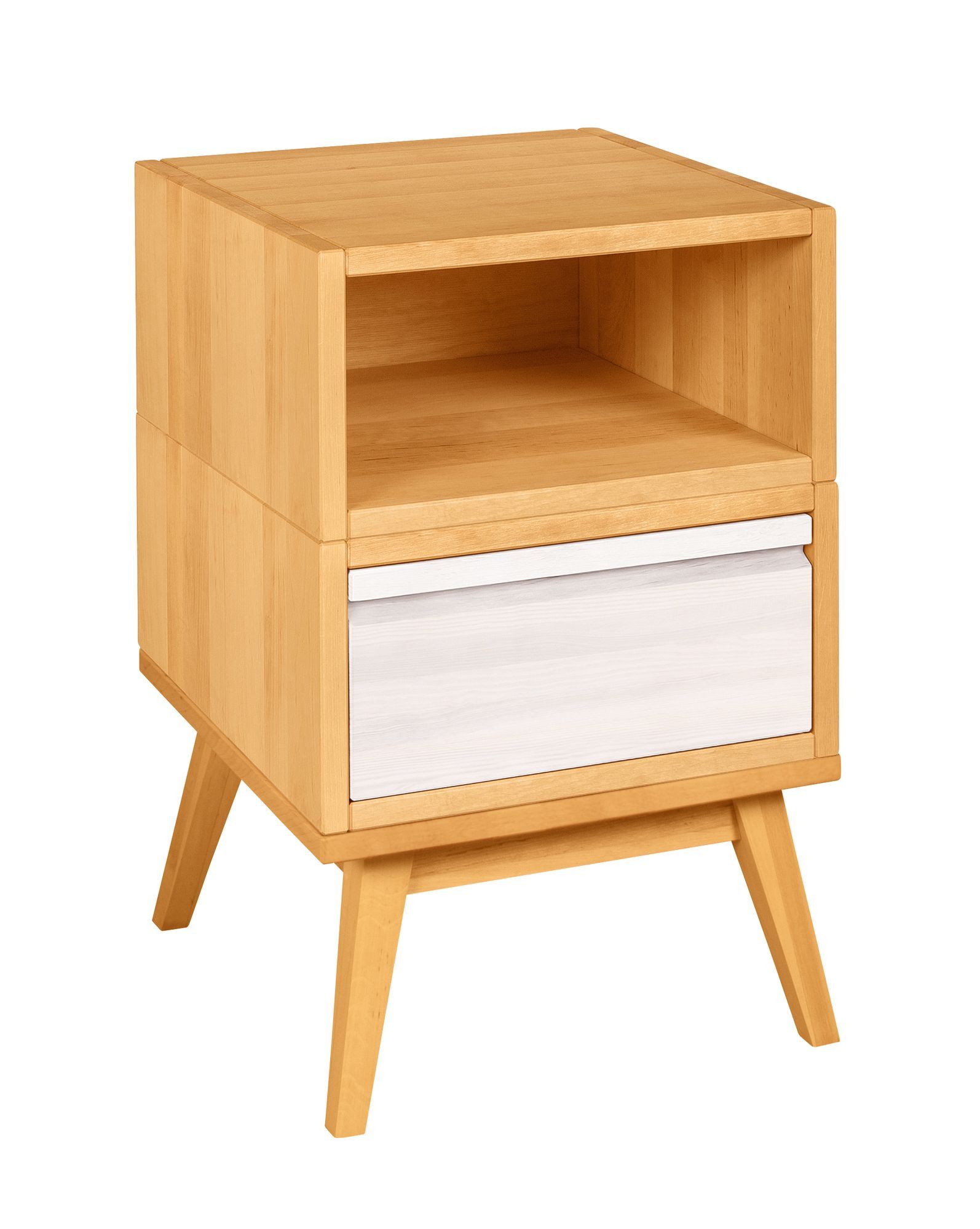 - Laura Retro Nachttisch mit Schublade und offen: 1 Schublade mit Leichtlaufschienen und Soft-Close-Mechanismus, elegant gefräste Griffmulden, 1 offenes Fach mit Rückwand. Inkl. Laura Verbindungsset.